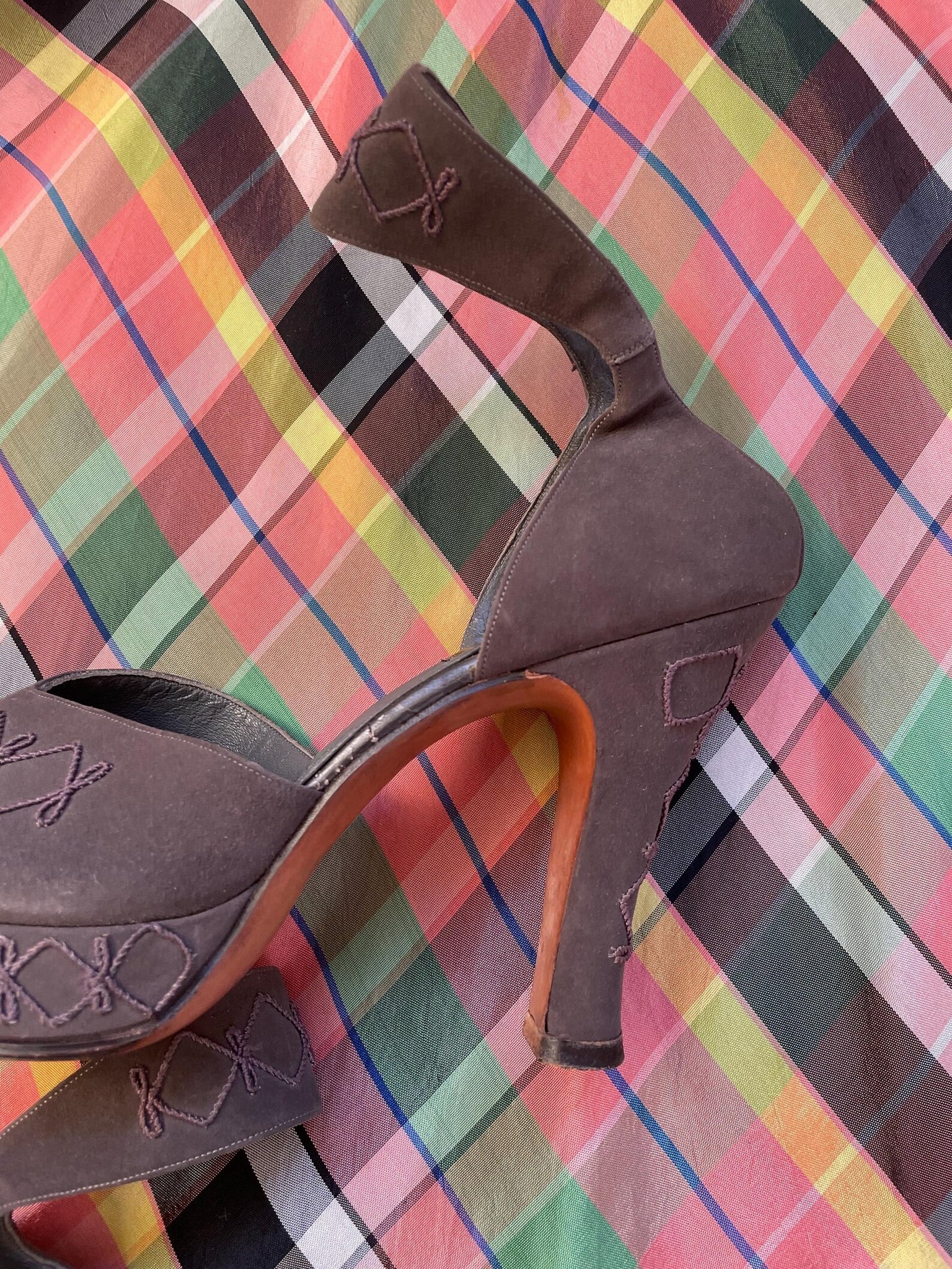 Stunning vintage 1940s peep toe high heels with ankle straps. Steely grey with a great blue ish tint fine quality soft calfskin with fine soutache trim. No closures. Straps with buckle closure and fine gold leather trim. Beautiful high heels, notched peep toes, platform base. Leather outer. Gorgeous!