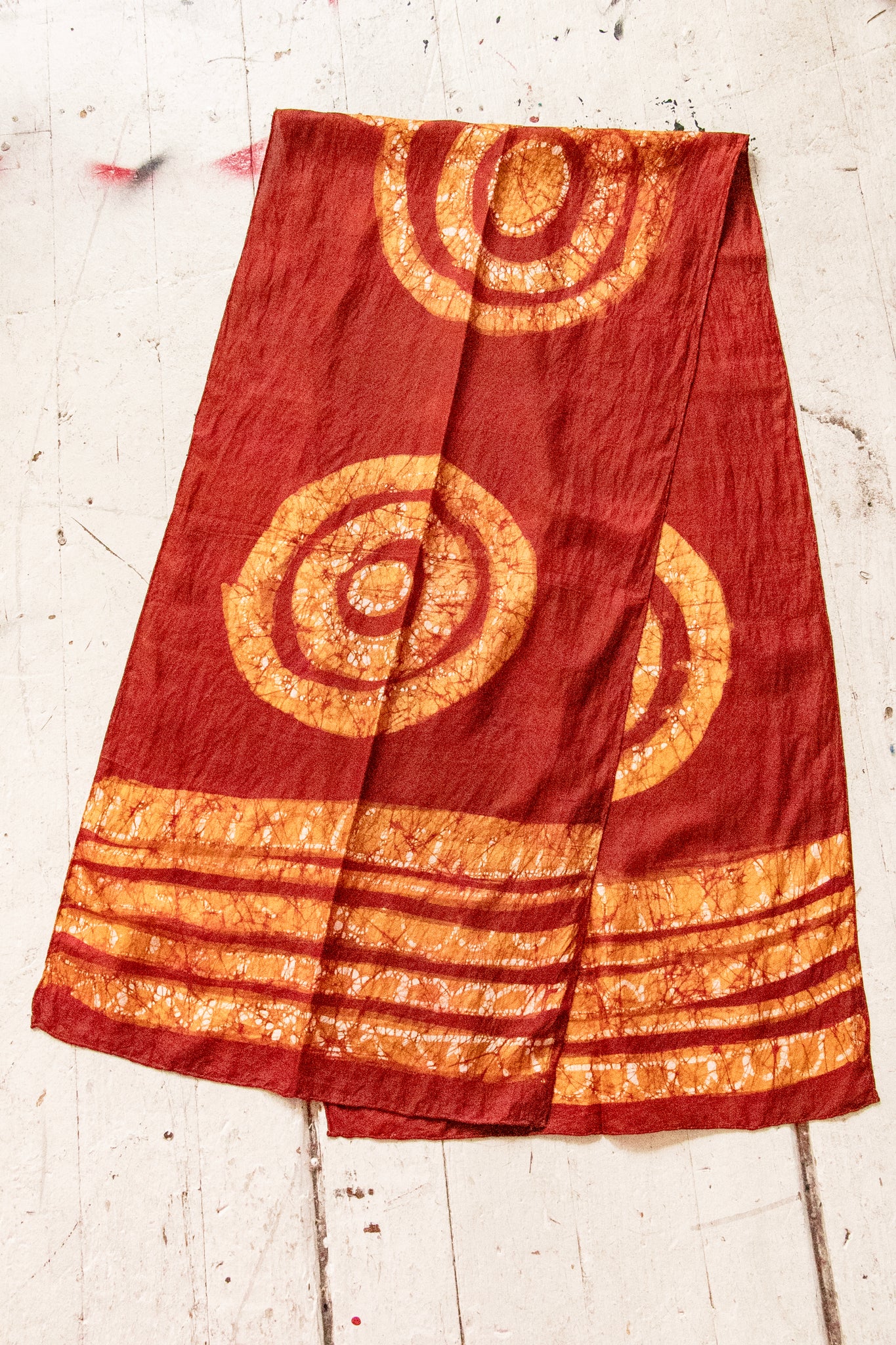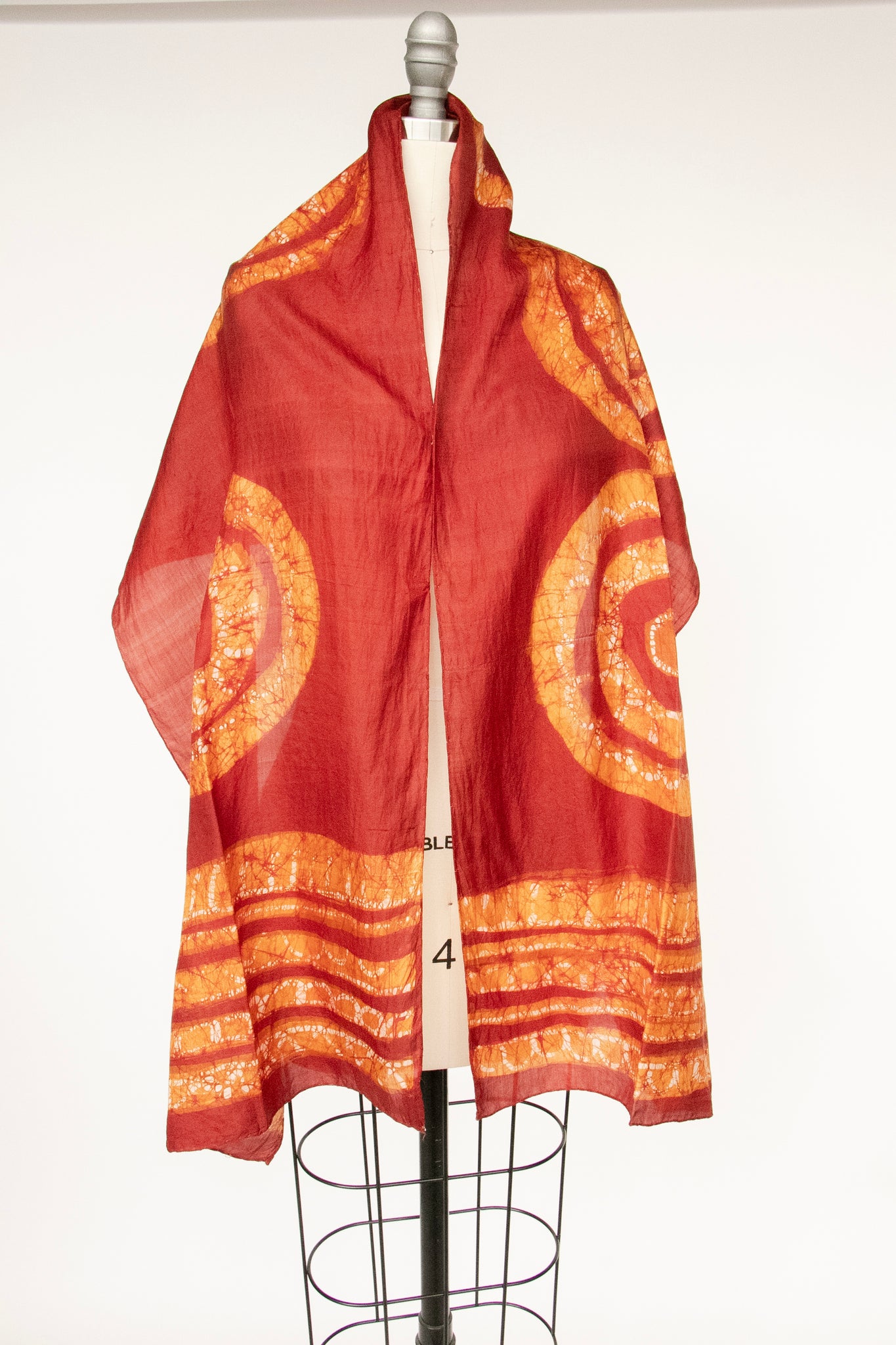 A lovely deadstock vintage early 1970s silk scarf hand woven, made in India. Extra large size, long rectangular shape is perfect for wraps or so many uses. Hand done tie dye job in shades of warm brown. Hand rolled edges. This fabric is hand made and show natural imperfections which add to its character.