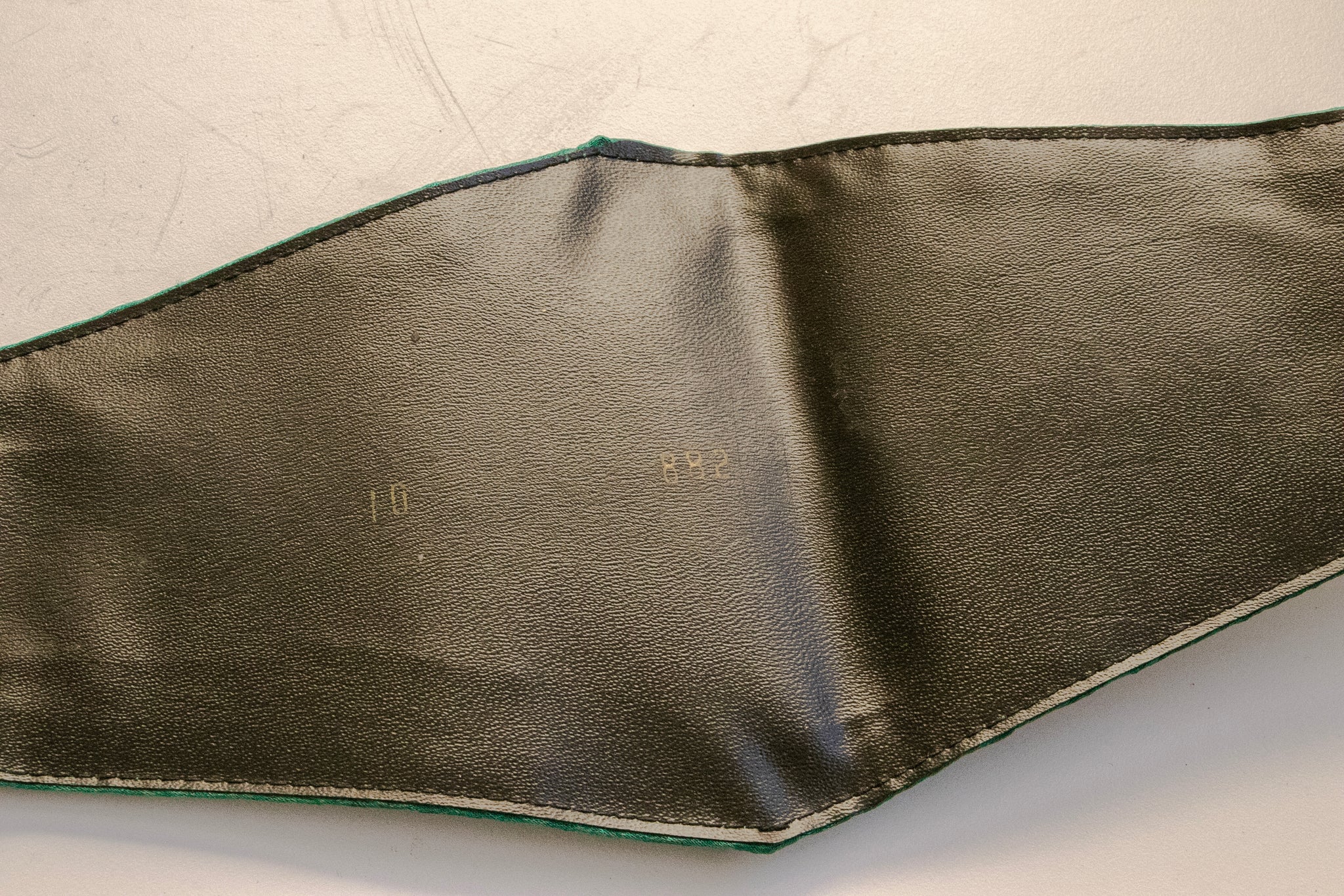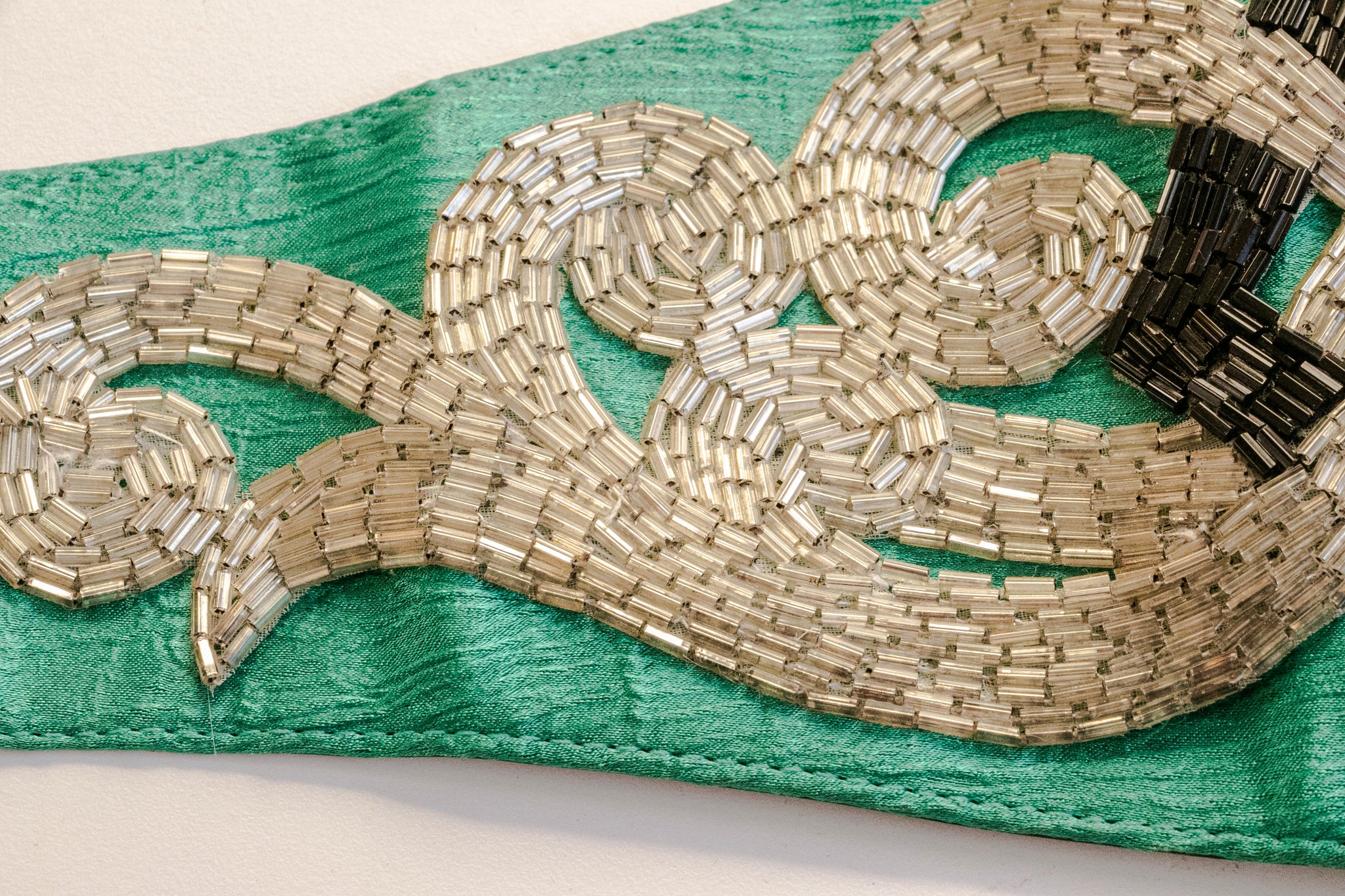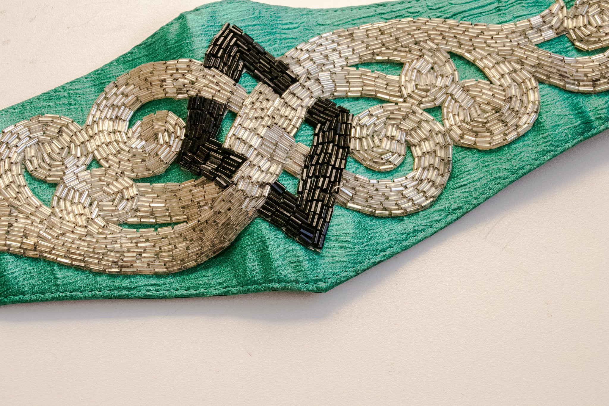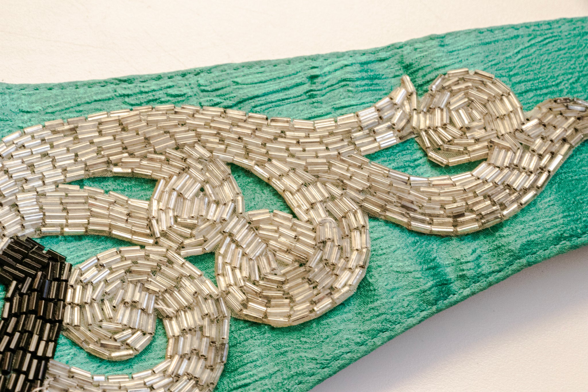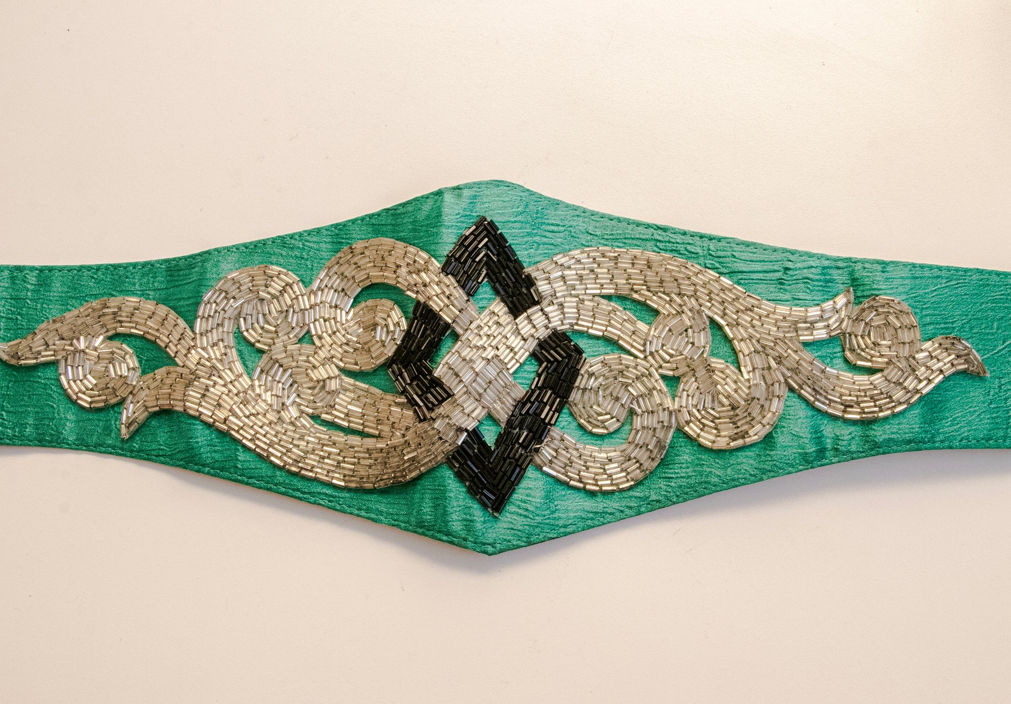 beltVintage 1980s gorgeous waist inch belt. Gaudy and colorful, teal shiny fabric with extensive silver and black beading. Vinyl backing and velcro closure. Wide and comes to points in the center.