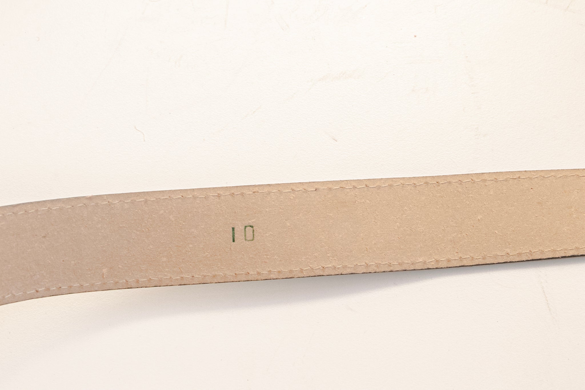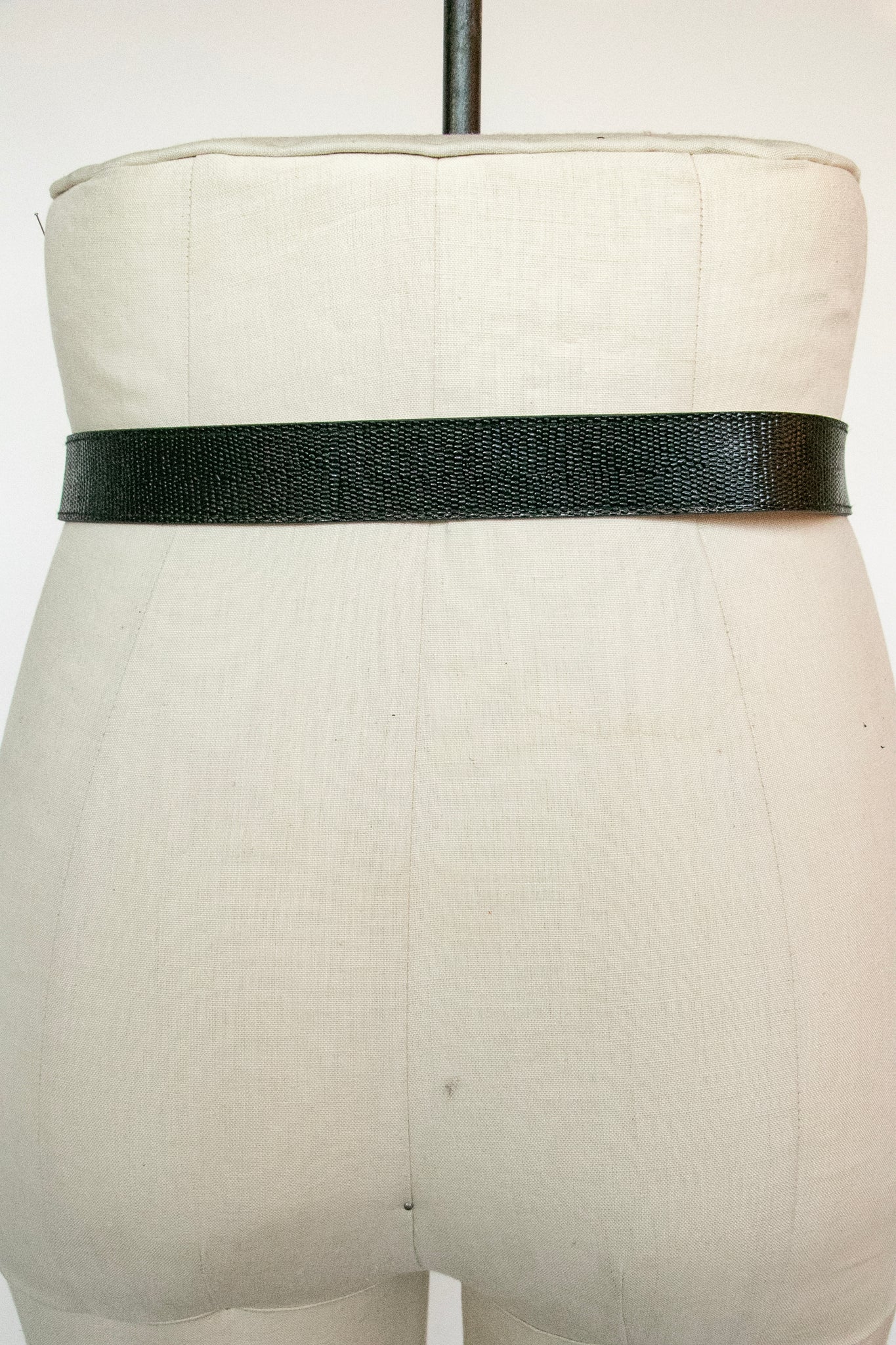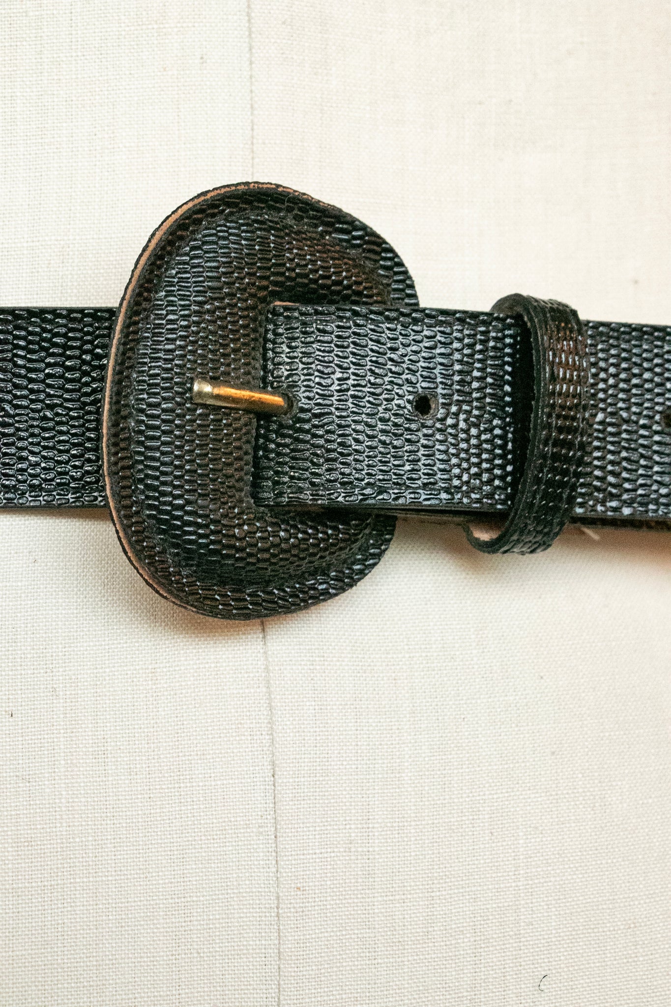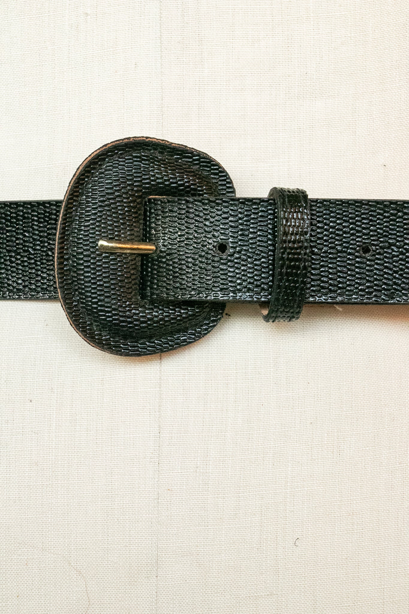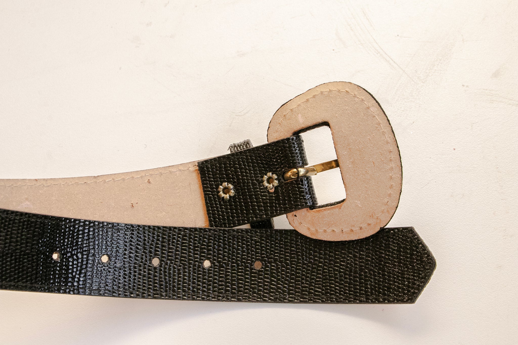 A vintage leather belt circa 1960s. Thick black leather band with embossed texture and matching buckle. Adjustable fit.