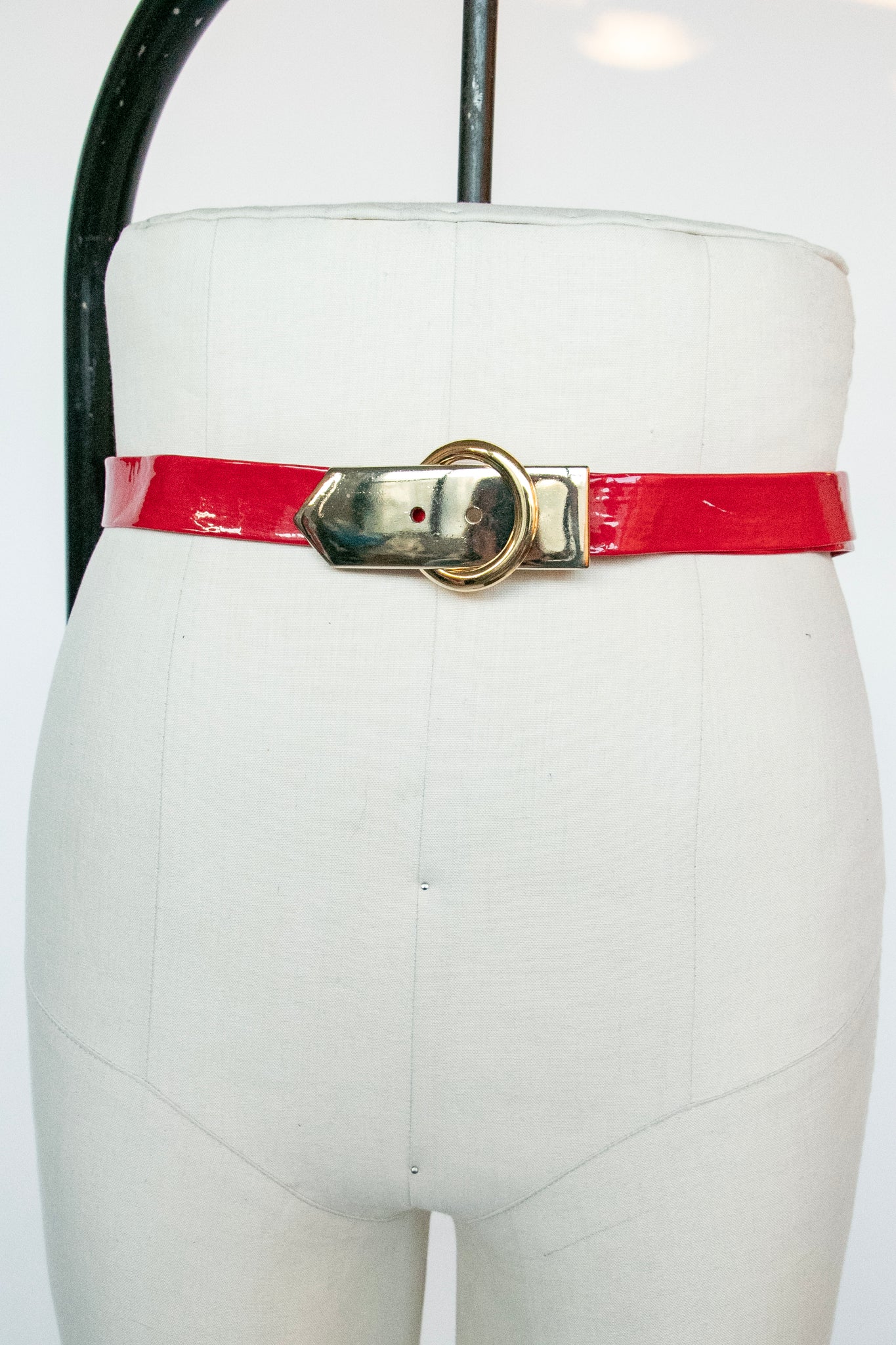 beltA vintage 1960s classic cinch belt of shiny red vinyl to look like patent leather. Simple band with a very cool gold tone buckle. Band is adjustable by looping through one side of buckle.