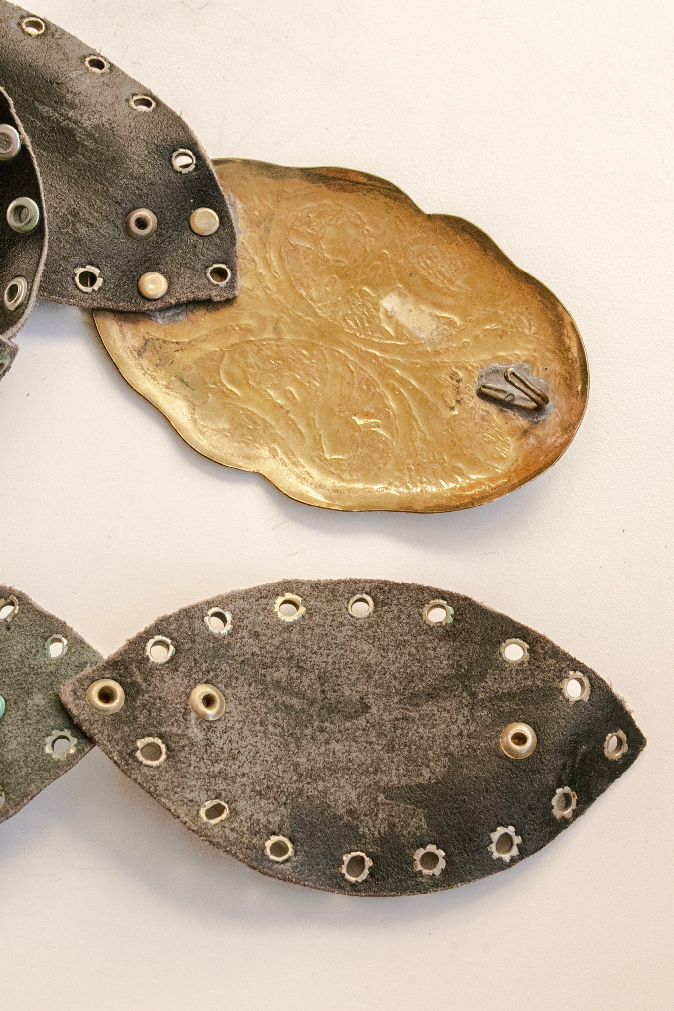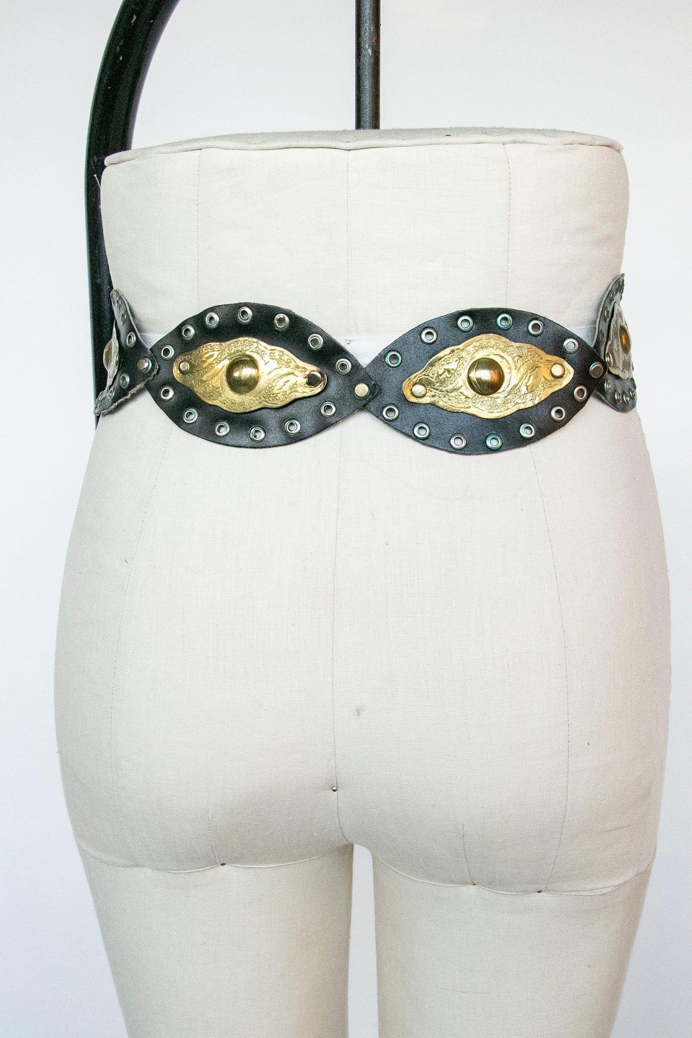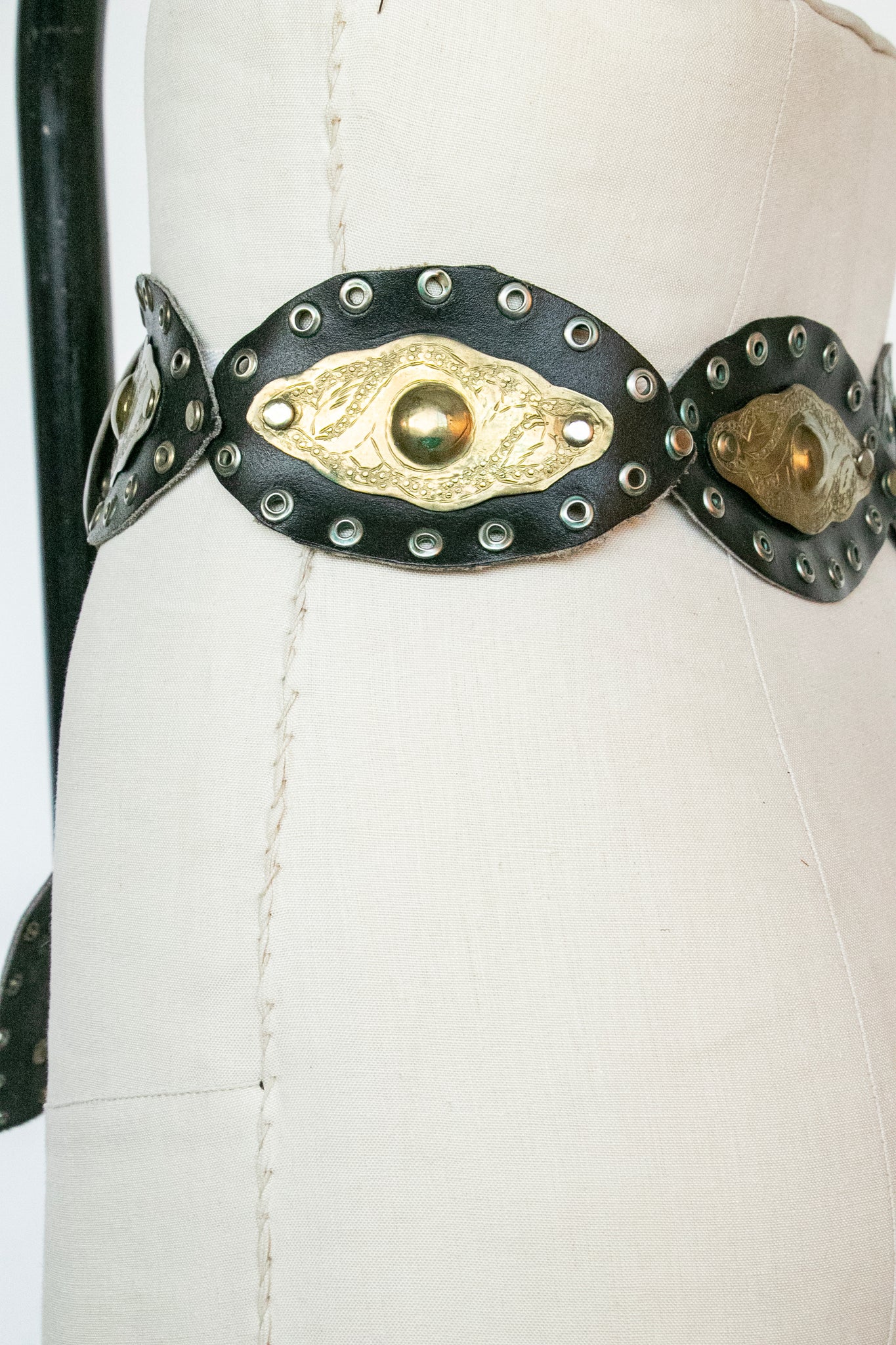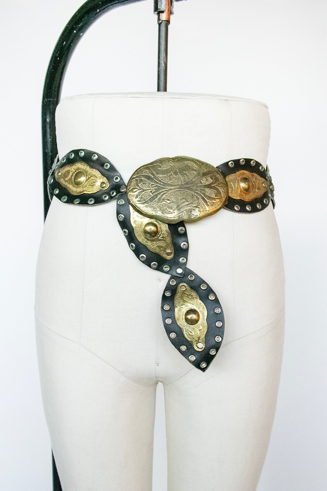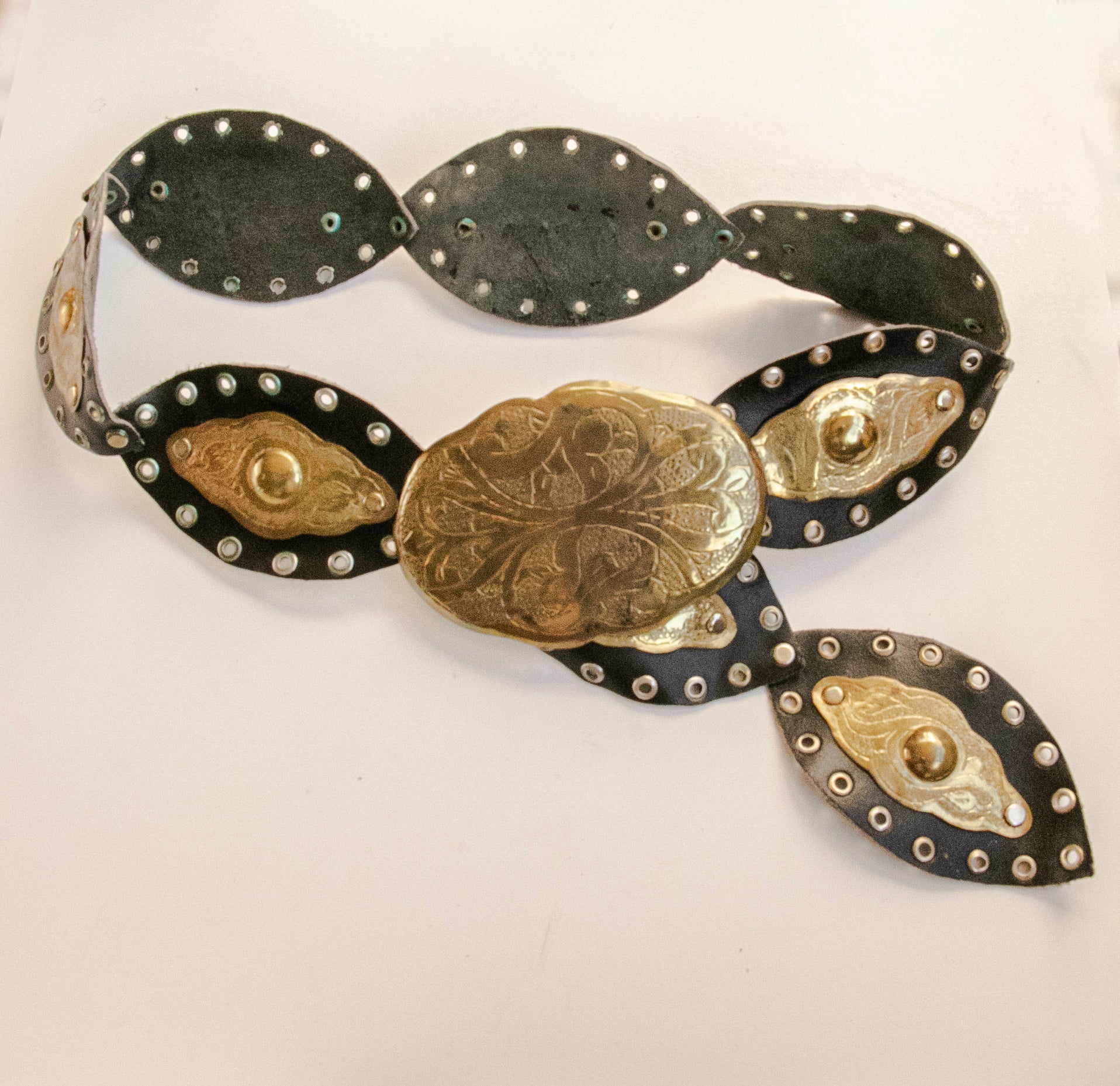 Vintage 1980s -70s boho belt. Oversized gold tone embossed rounded circle shaped buckle with hidden hook closure to loop on to any anywhere on the band. Soft yet sturdy black leather thick tear top like cut outs that are grommeted together. Looks great slung low on the hips or around the waist.