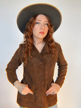 Gorgeous and understated vintage 1970s boho suede leather light weight jacket. Leather is super soft and supple in chocolate brown. Fully whipped stitch construction, perfectly fitted to a lady, bust darts, bracelet length sleeves with decorative button, open back flap, notched collar, patch pockets. Rolled leather button front. Unlined.