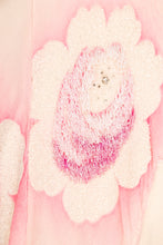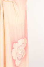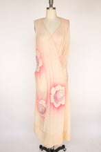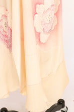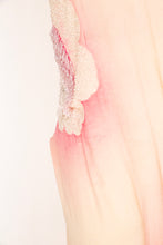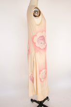 A gorgeous 1920s - antique dress. Beige with peachy pink tone silk chiffon. Unique asymmetric design. Stunning, super heavily done, intricate 3D floral beading win pinks and ivory with air brushing surrounding. Sleeveless, V neck, relaxed fit. Pulls on with no closures - keep in mind when considering fit. Unlined and semi-sheer.