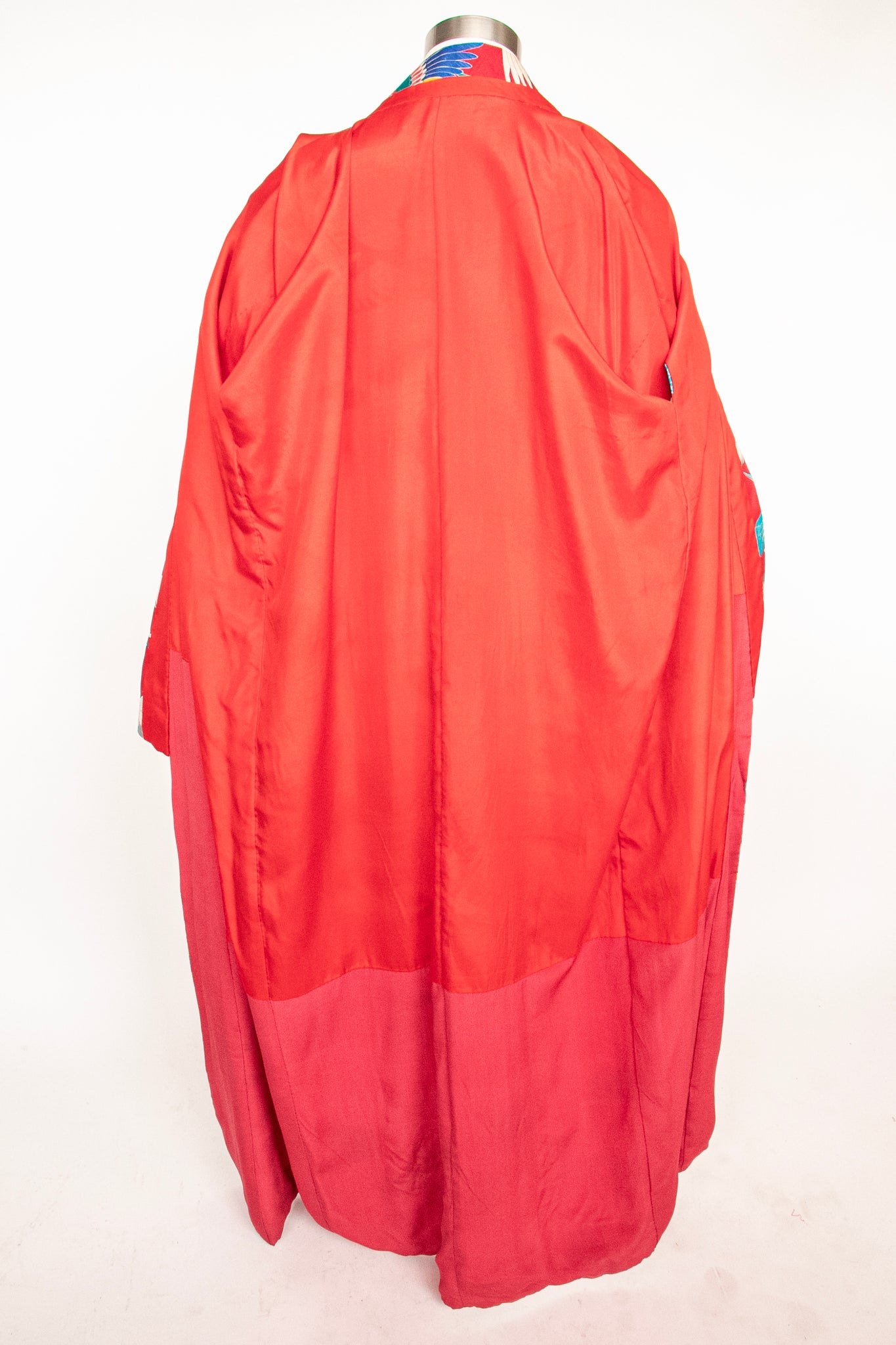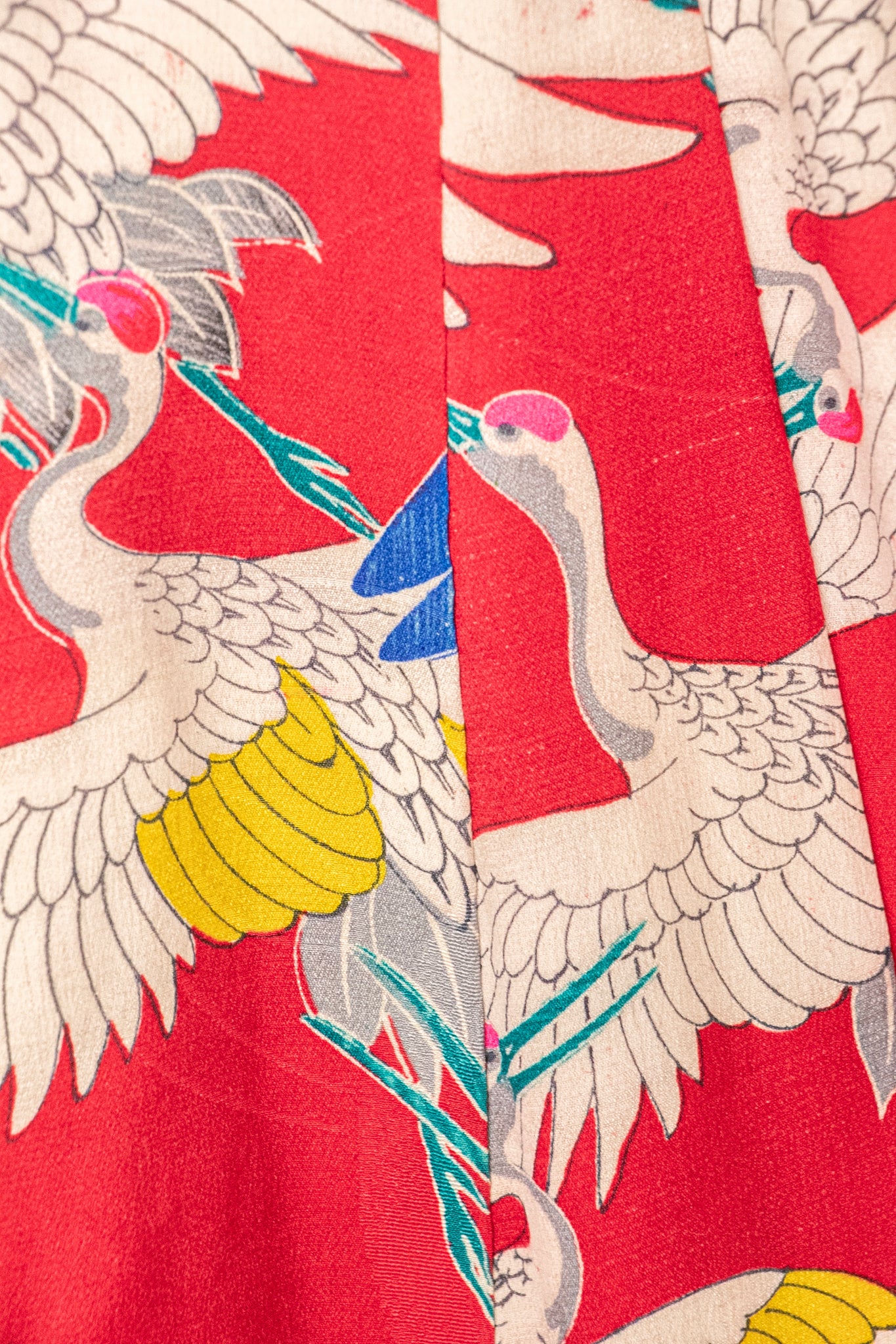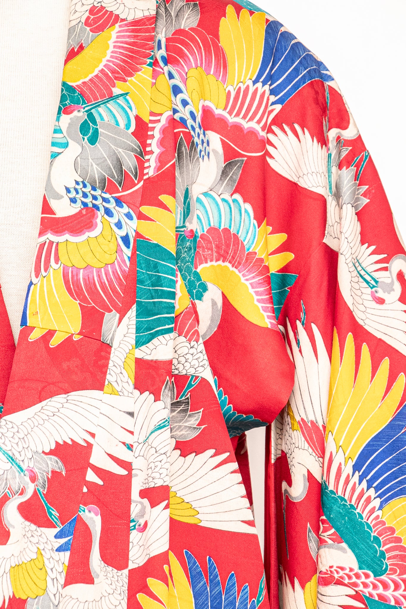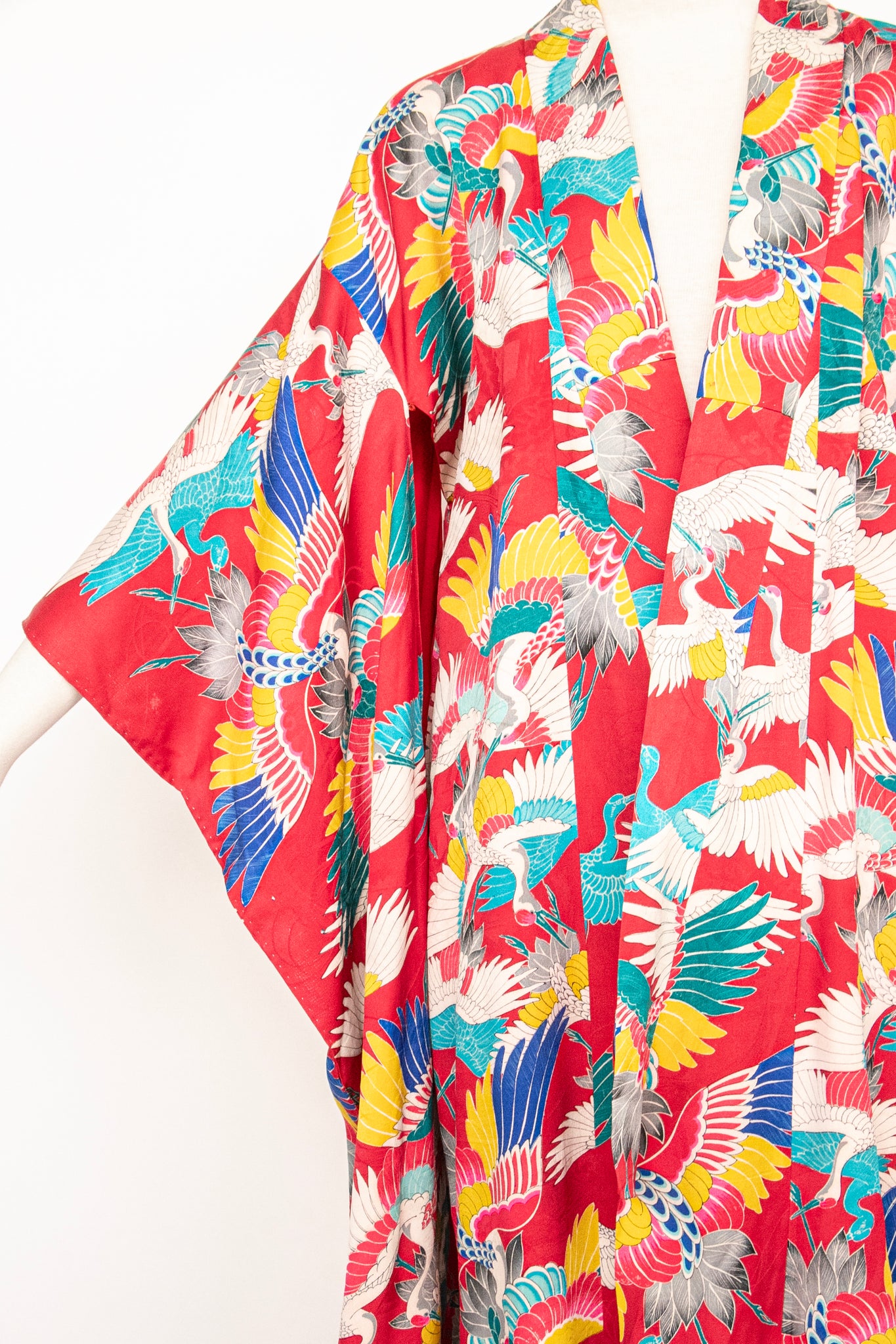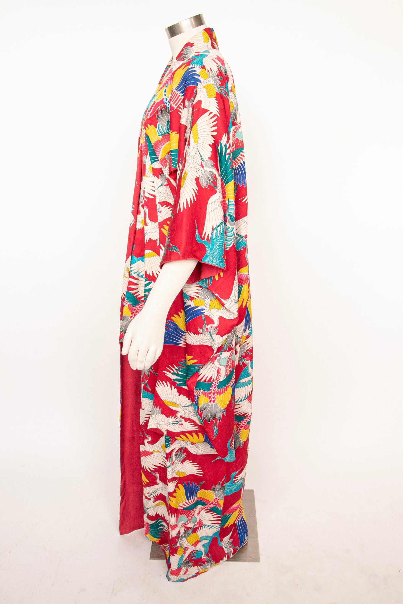 A gorgeous vintage 1940s - early 50s Japanese full length kimono of very fine silk in a beautiful and vibrant multi colored crane print. Classic kimono sleeves, relaxed fit, long draped sleeves. No closures. Lined in red silk.
