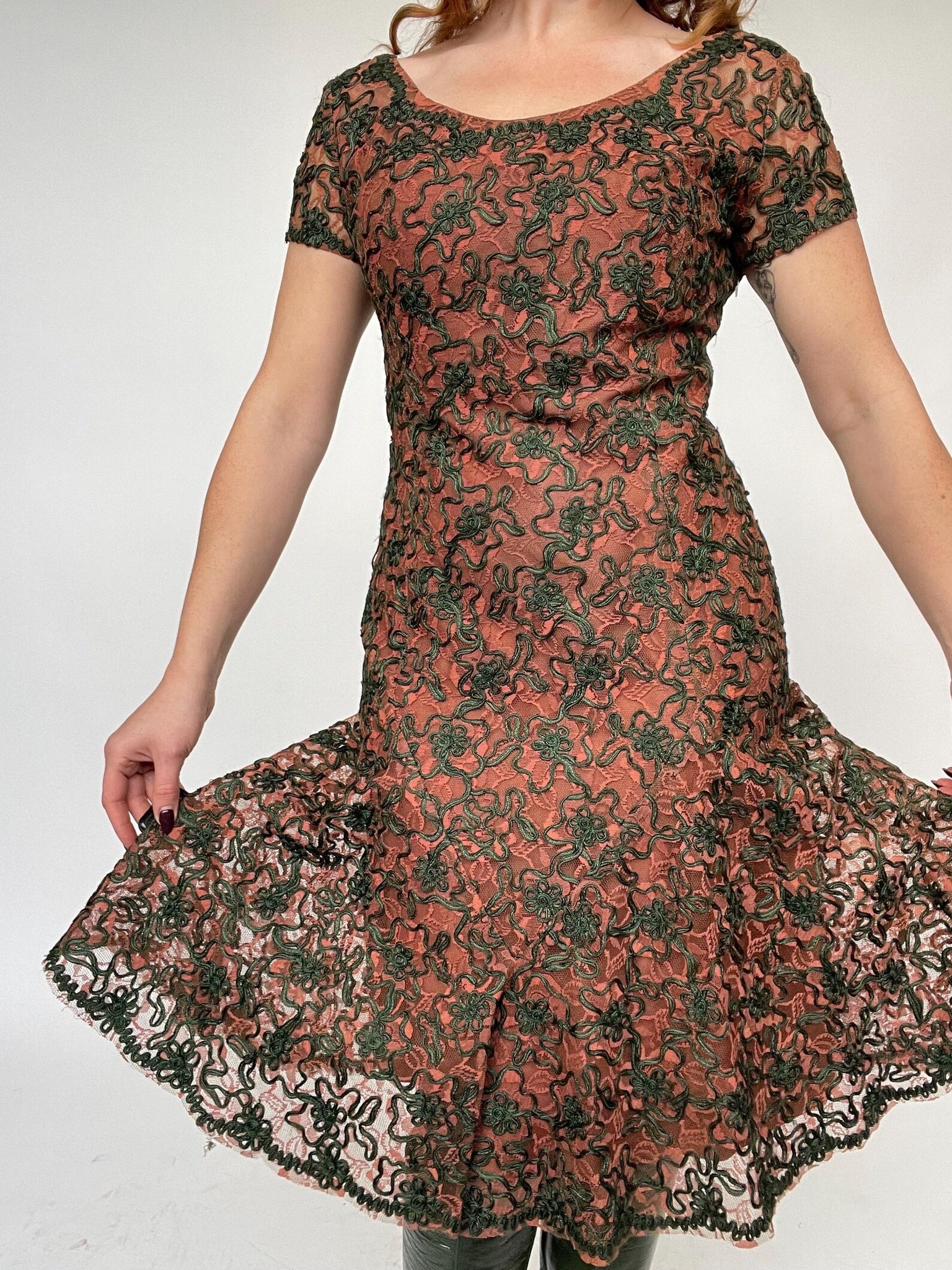 A lovely vintage 1960s cocktail dress. Unique construction, mermaid silhouette. Brown crisp nylon lace with moss green raised texture trim sewn over top with an acetate backing. Cap sleeves, boat neckline, illusion back. Fitted though the hip with a multi panel mermaid lower skirt. Hidden back nylon zipper.