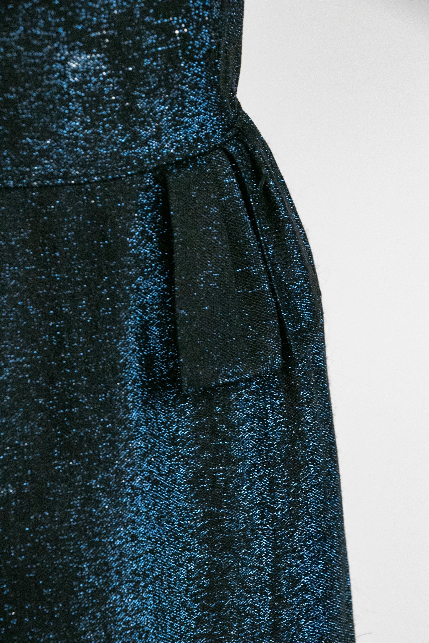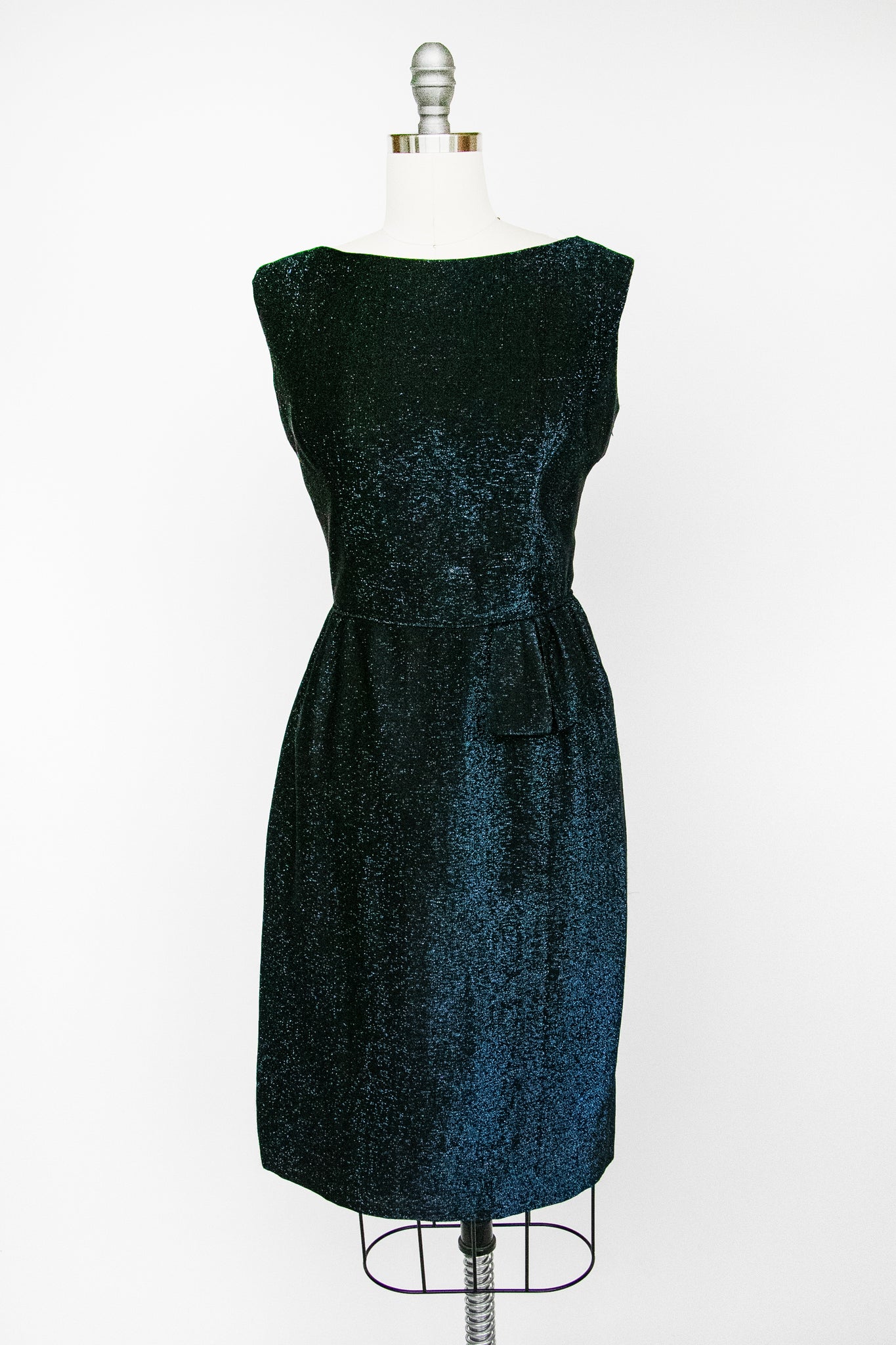 Vintage 1960s wiggle dress made in super cool electric blue metallic lame on black weave. Hourglass fitted silhouette. Sleeveless, high boat neckline, darted bust. Gathering and flap embellishment at fitted waist with a slim cut, back kick pleat wiggle skirt. Lined in black acetate. Hidden metal black painted zipper.