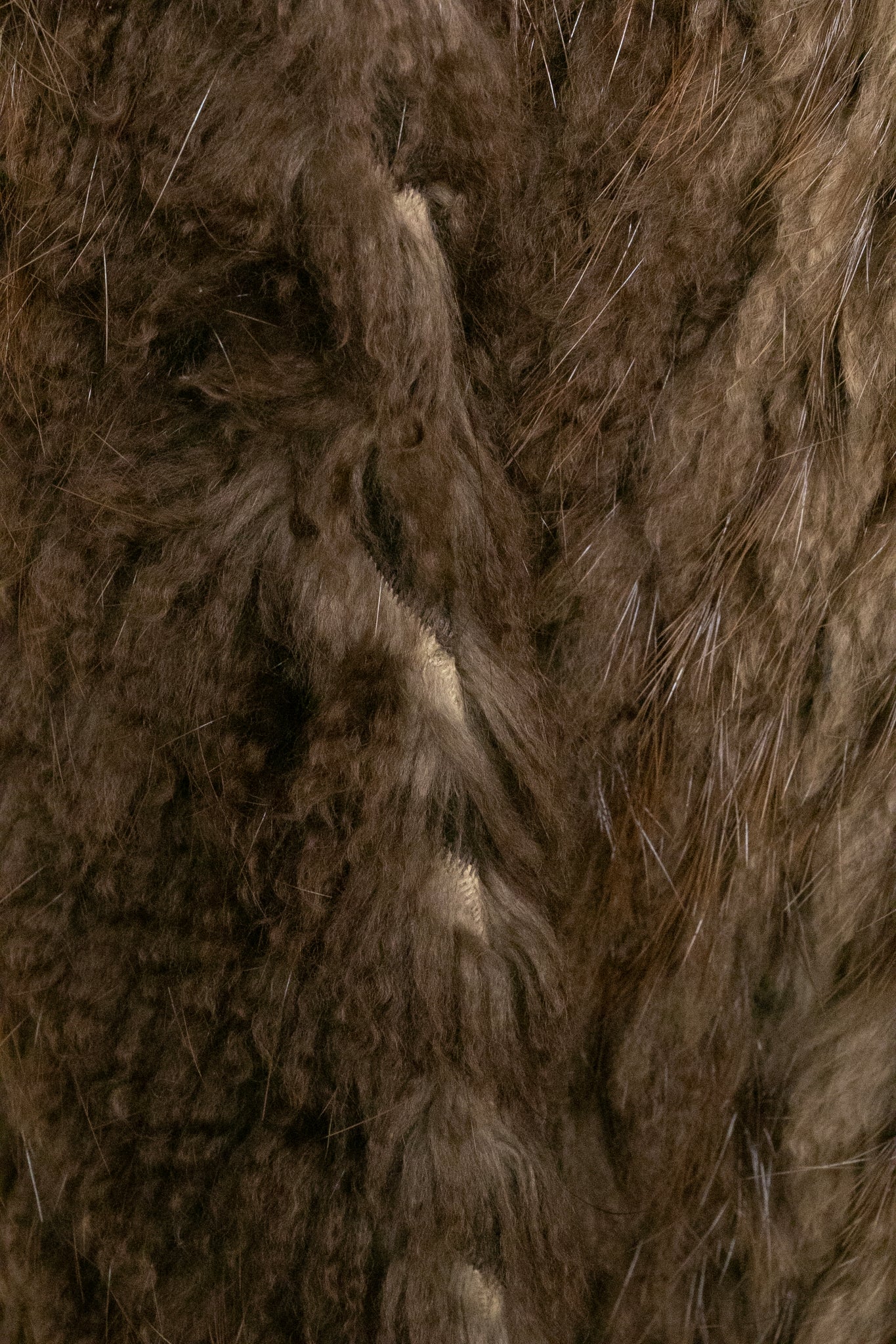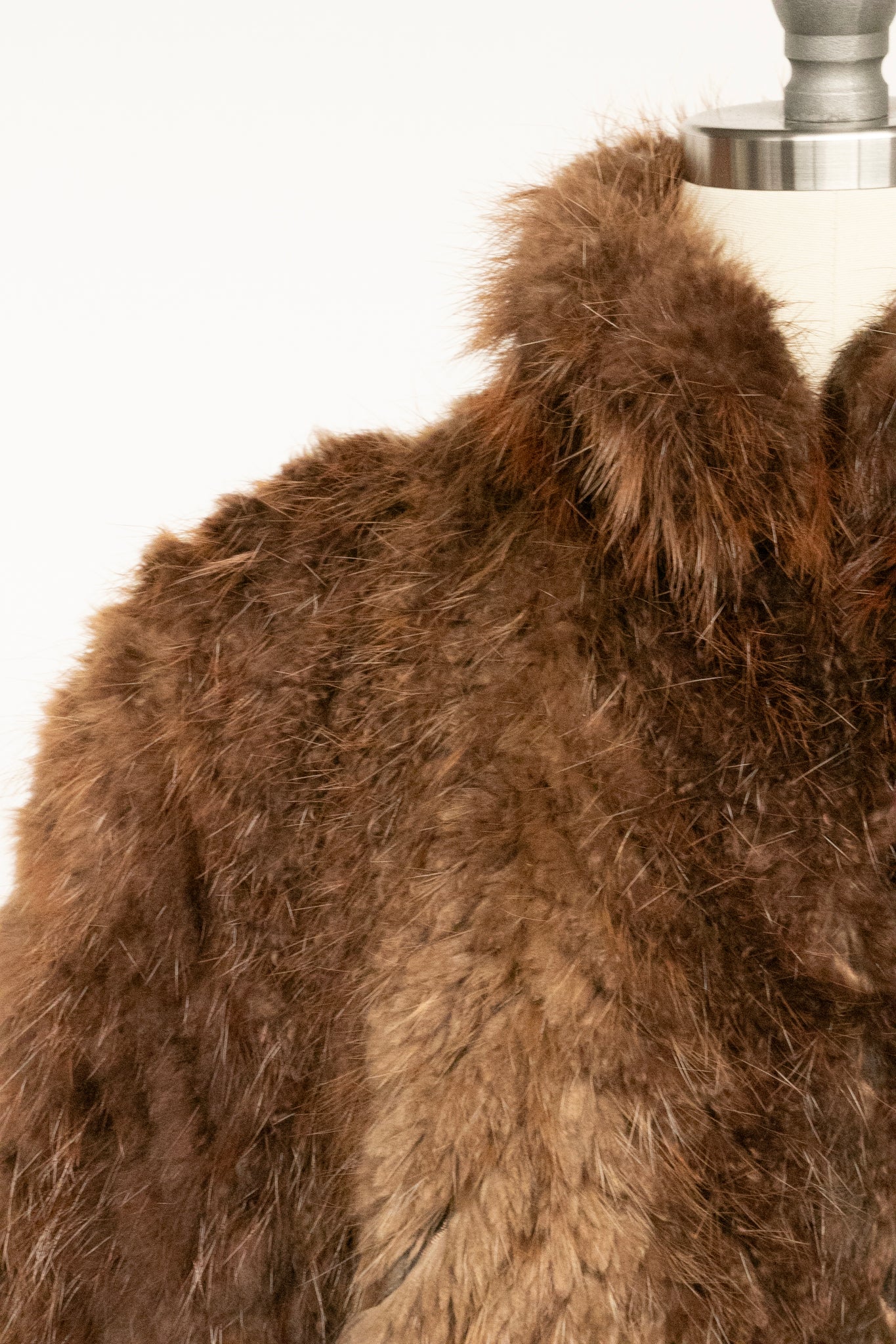 A gorgeous vintage 1960s muskrat fur coat. Chevron striped design of fur bands with suede in between. Super plush and nice long pule textured fur in a reddish tinted brown. little mock neck collar, long sleeves, mid length, relaxed straight silhouette. Heavy duty hook and loop closures. Tw0 hidden hip pockets. Lined in brown satin with a large stitched monogram.