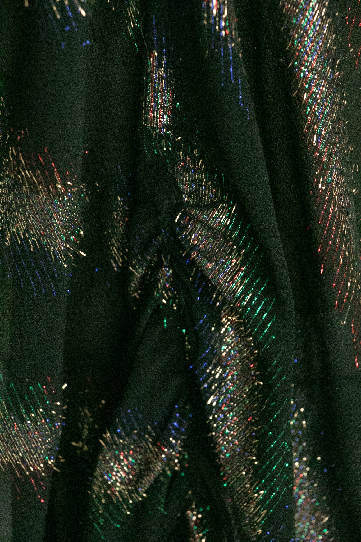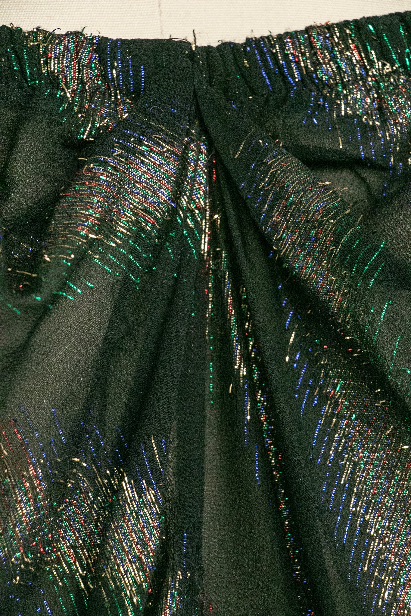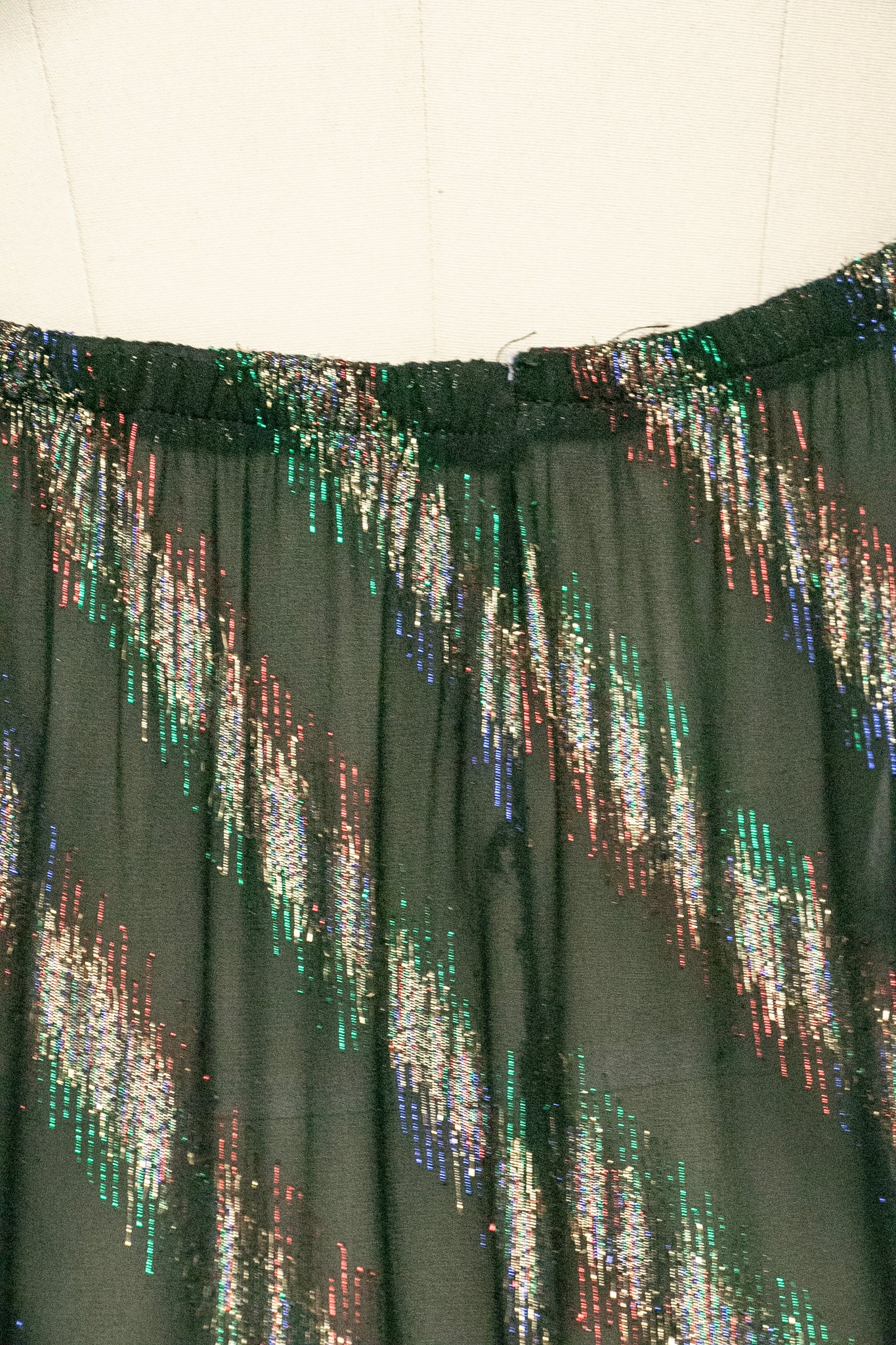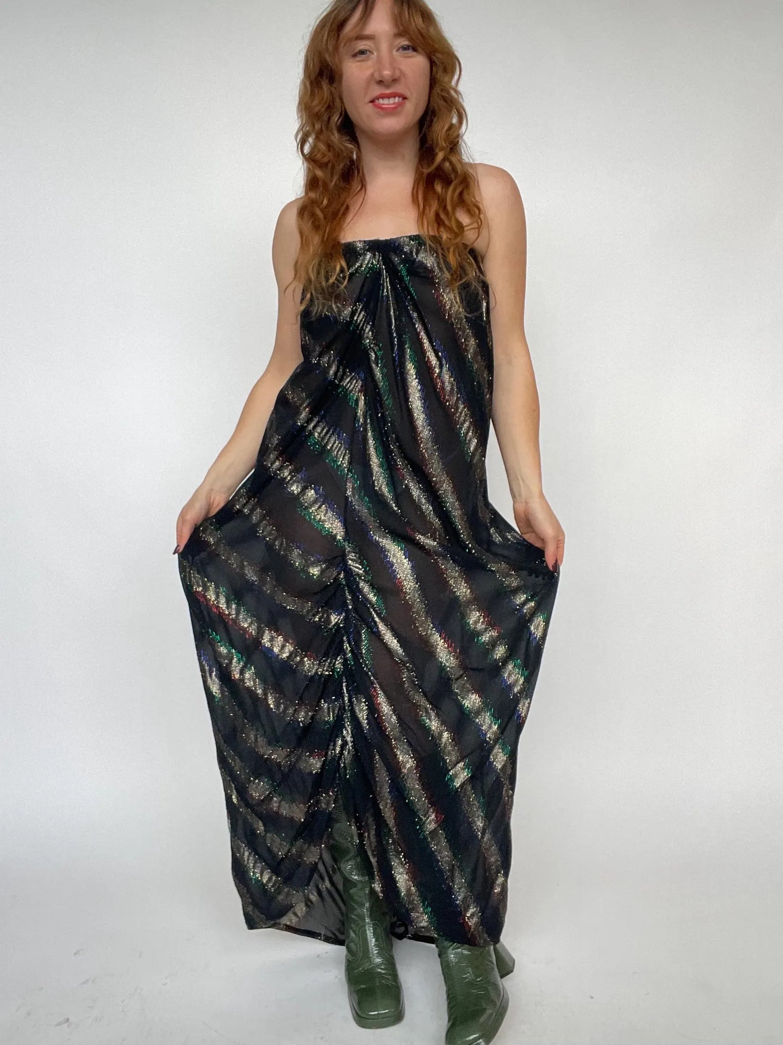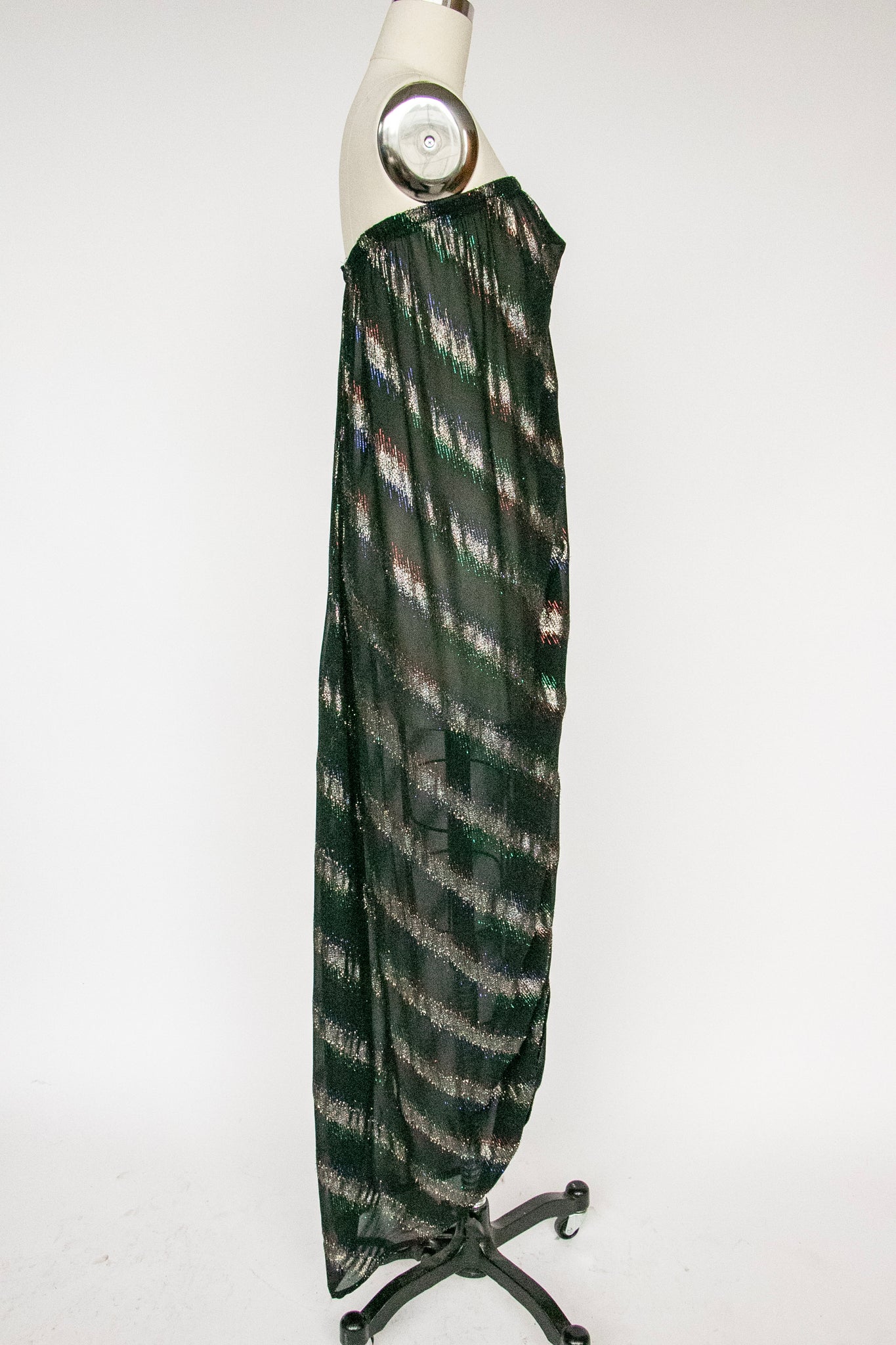 A gorgeous vintage 1970s grecian style disco dress made of the most luxurious black sheer silk chiffon with multi colored textured metallic weave. Elastic stretch tube top with gathered center seam. Pulls on with no closures. Sheer.