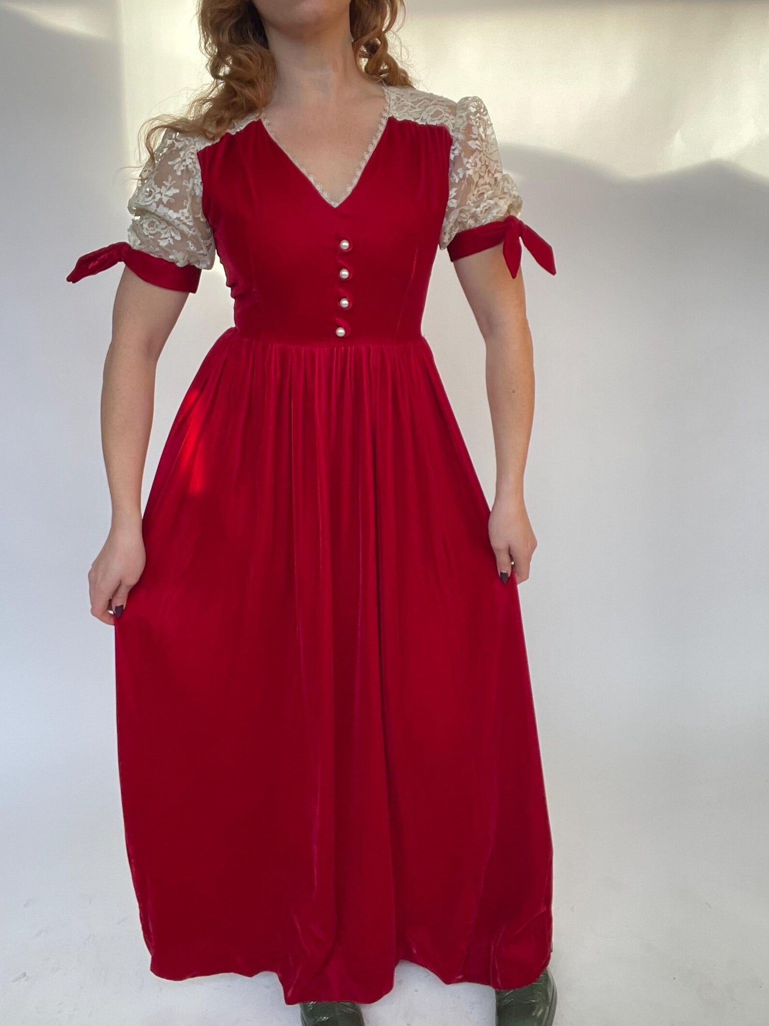 A lovely vintage 1970s full length maxi gown of lush deep red nylon velvet with off white lace trim at neckline and sheer off white nylon lace roofed short sleeves. Velvet bow ties at cuffs of short sleeves. V neck bodice with decorative look button detail. Gathered waist full length skirt. . Hidden back nylon zipper Unlined.