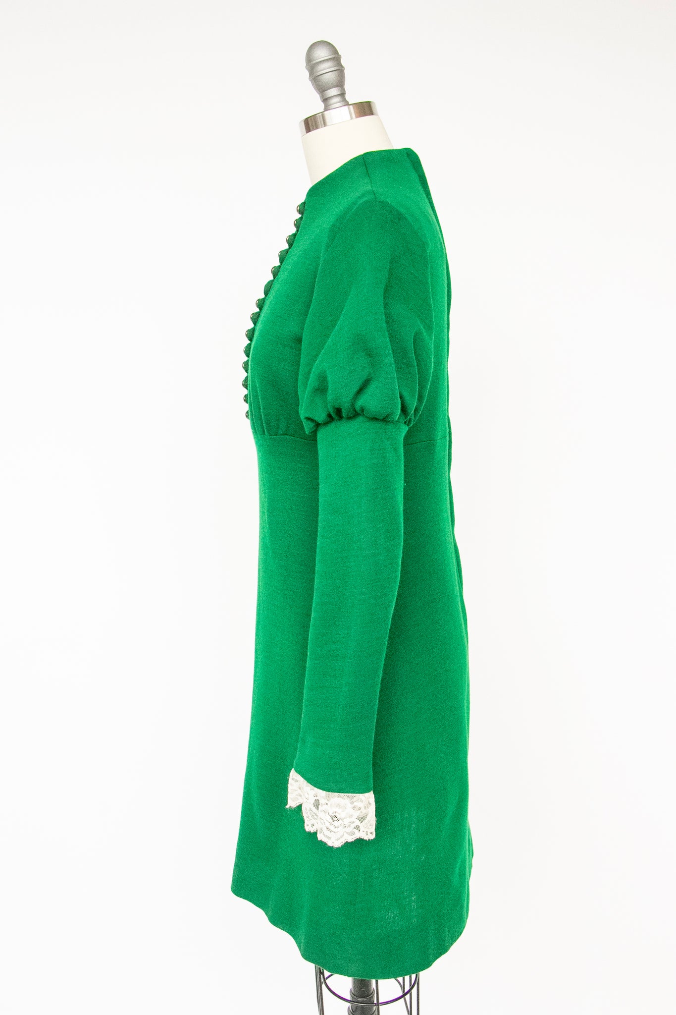 Vintage 1970s adorable and cozy Young Edwardian dress. Forest green double knit acrylic. Mutton sleeves with ruffle lace cuffs. Empire waist with loop button front. Hidden back nylon zip. Unlined - may want to wear with a slip.