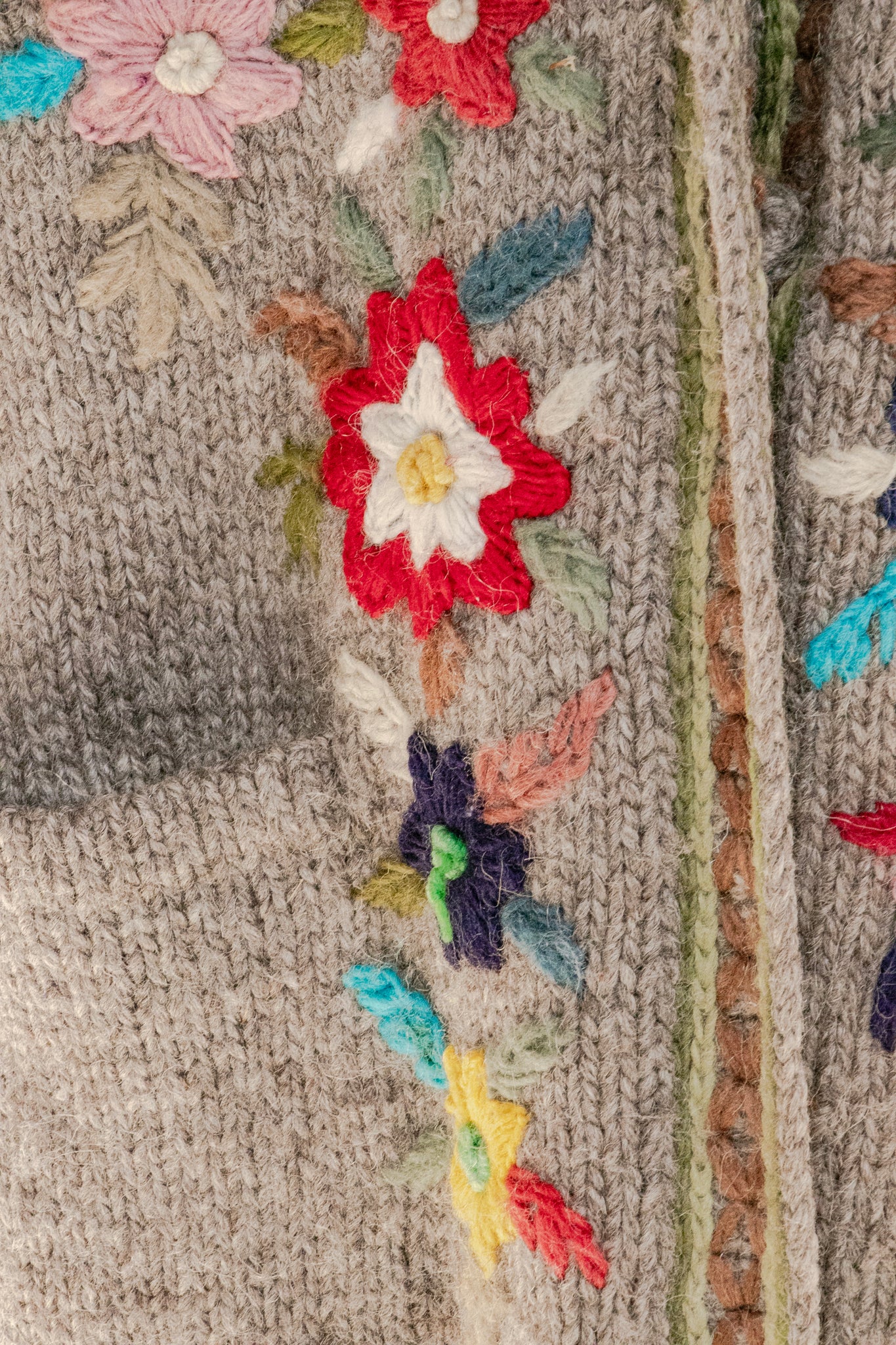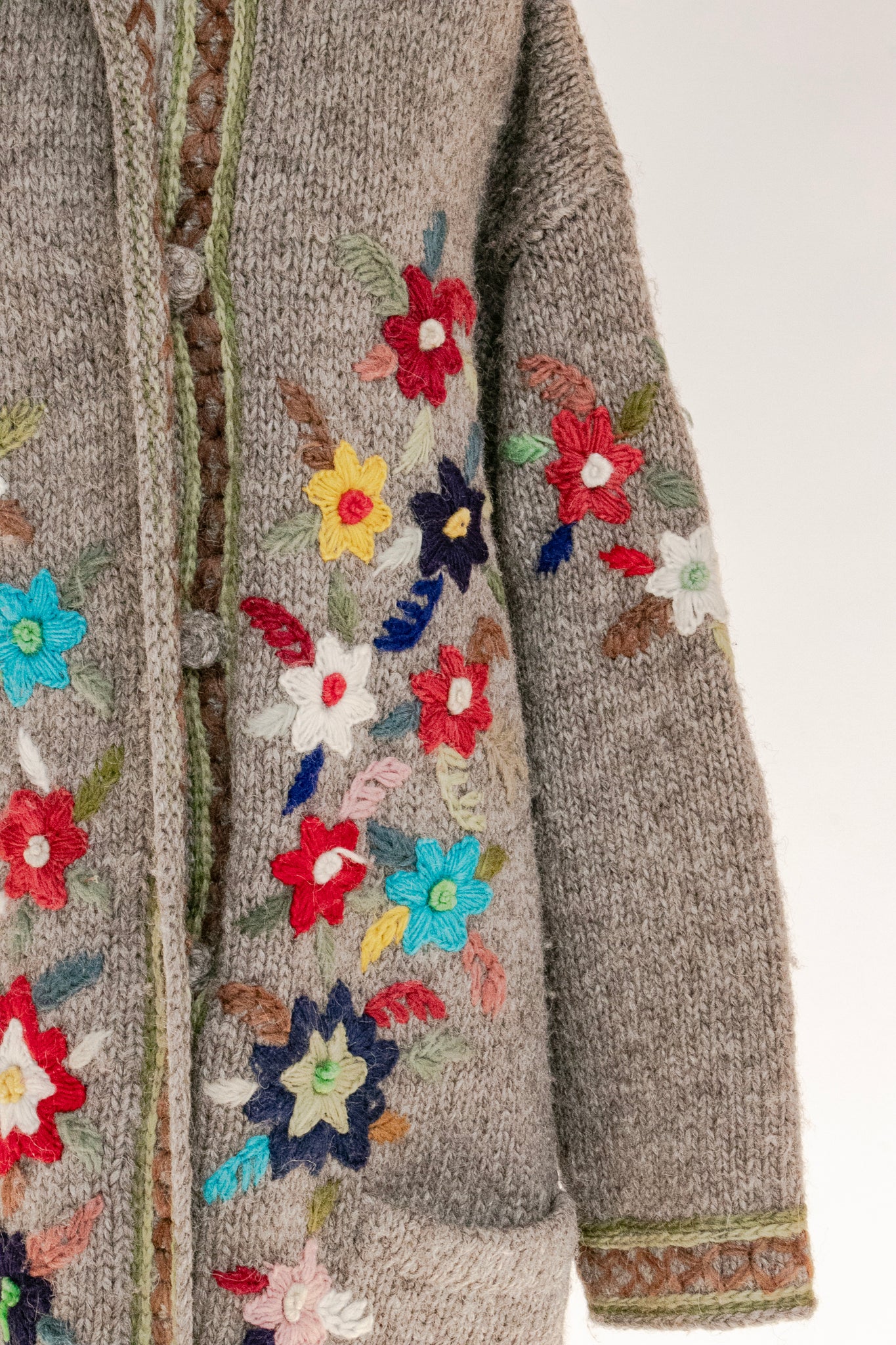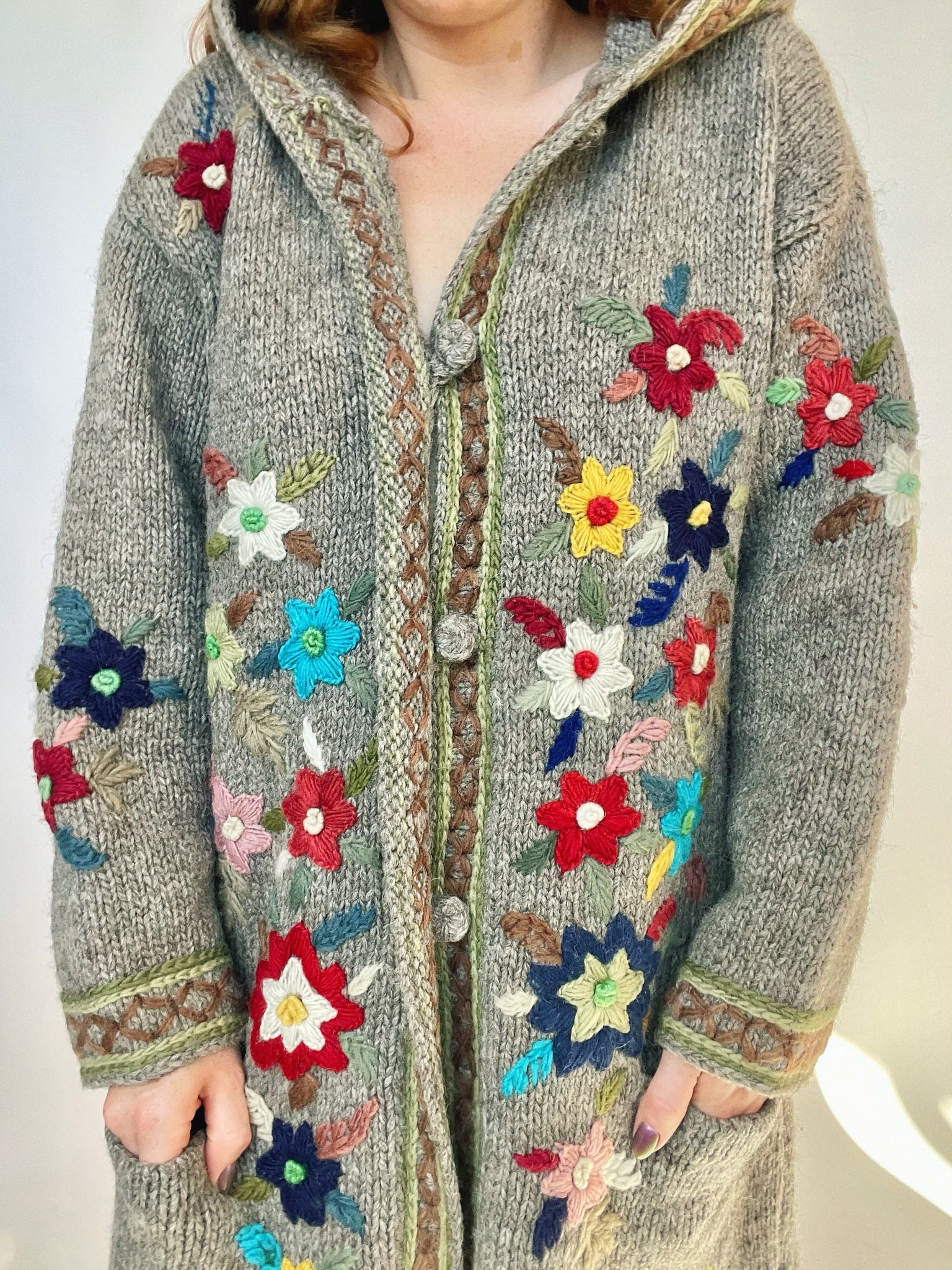 1970s Sweater Wool Chunky Knit Floral Hooded Long