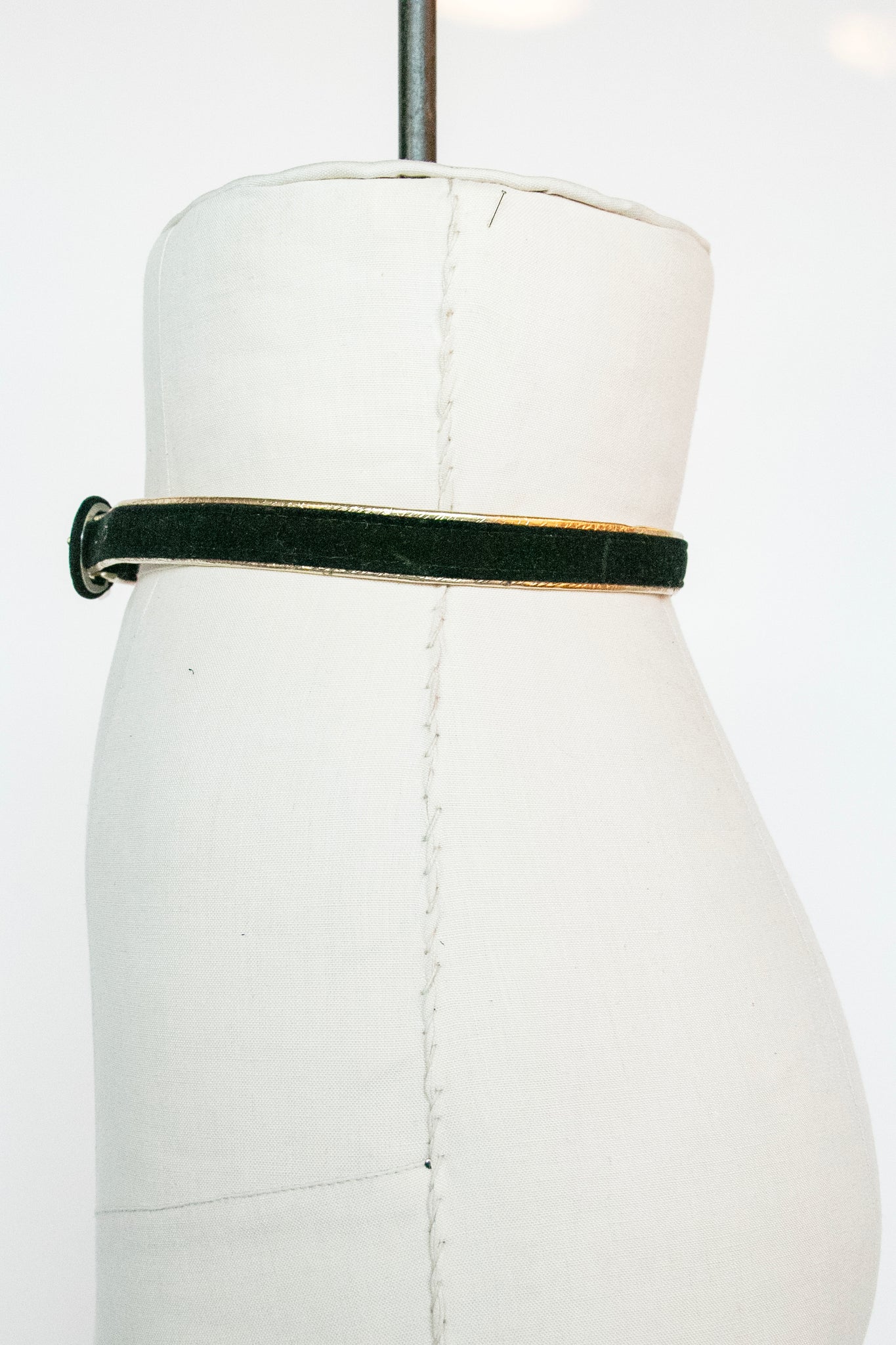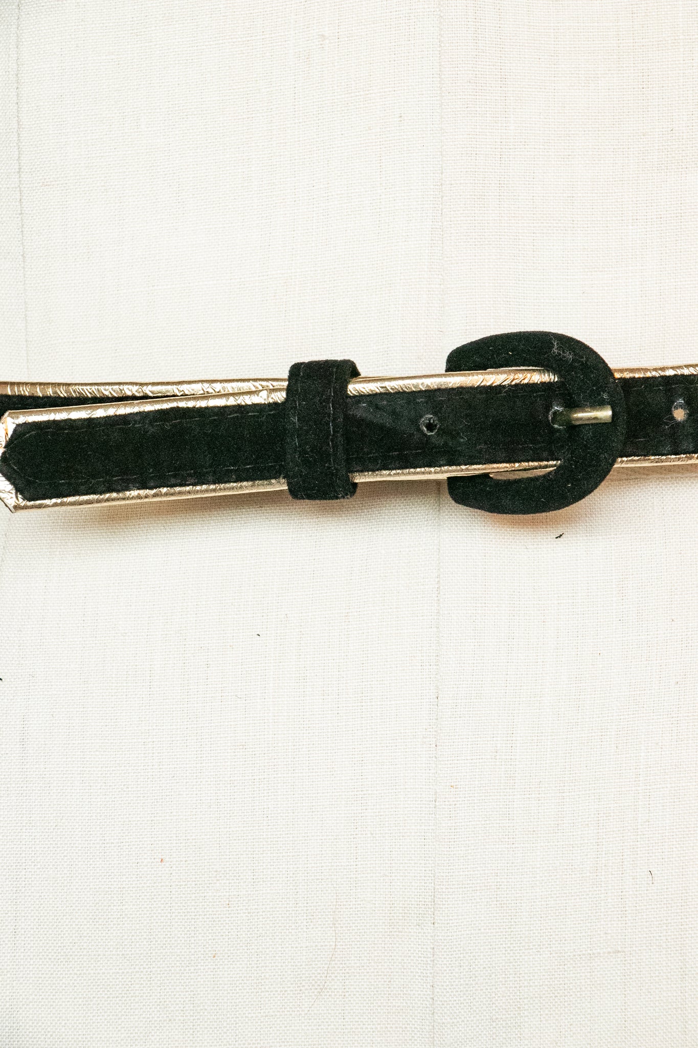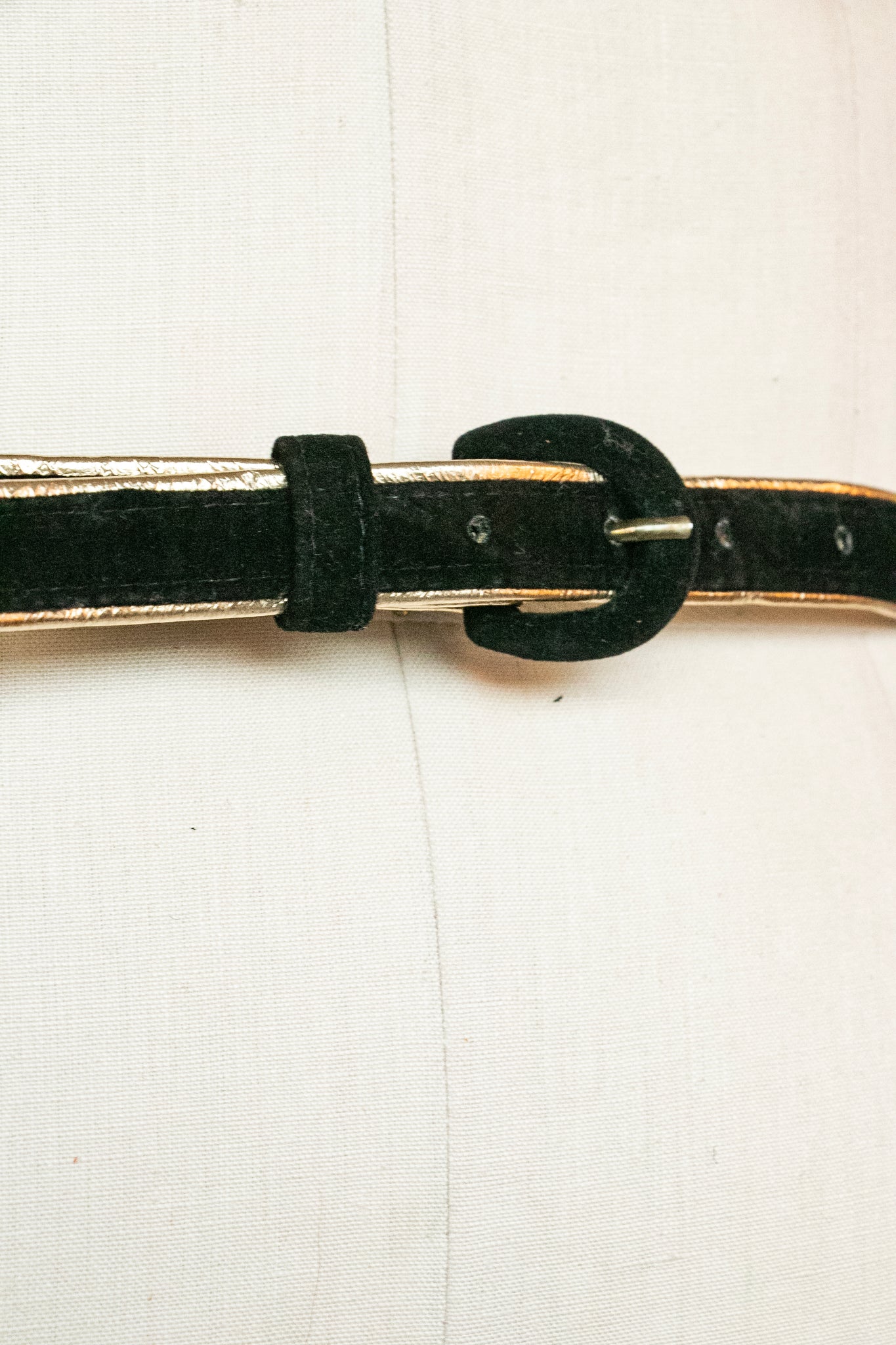 beltA vintage 1950s thing waist cinch belt of black crushed velvet with gold foil edges and backing. Simple rounded shape buckle, adjustable fit.