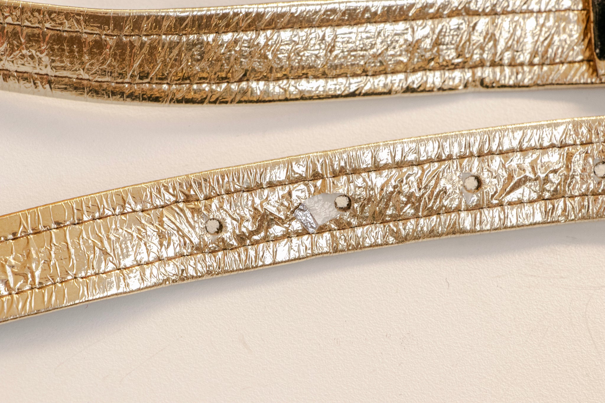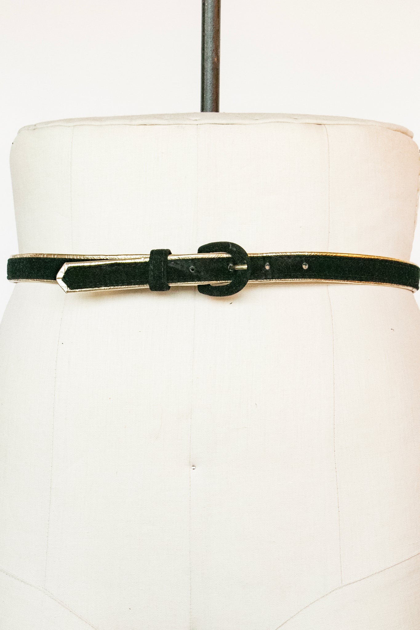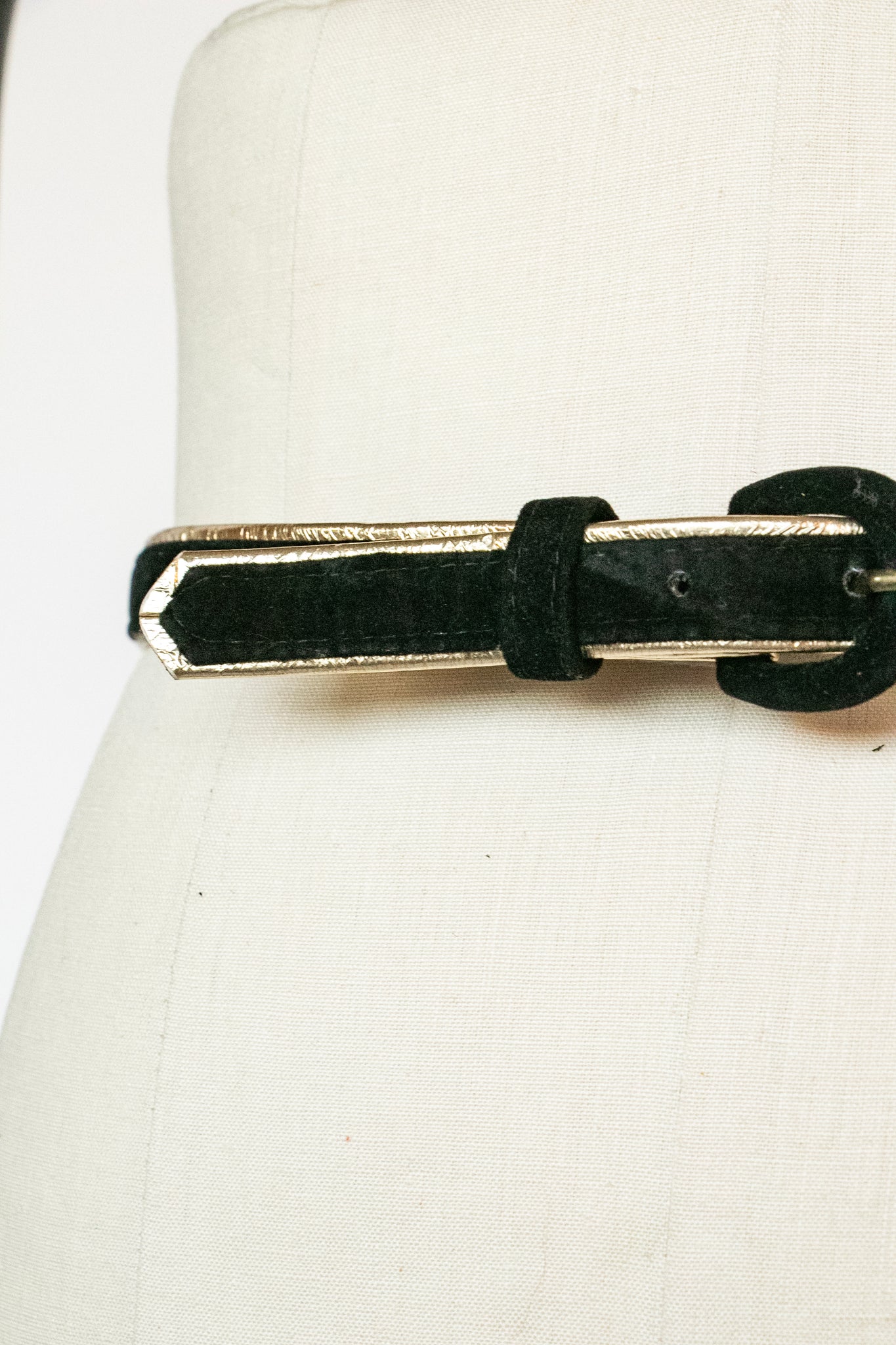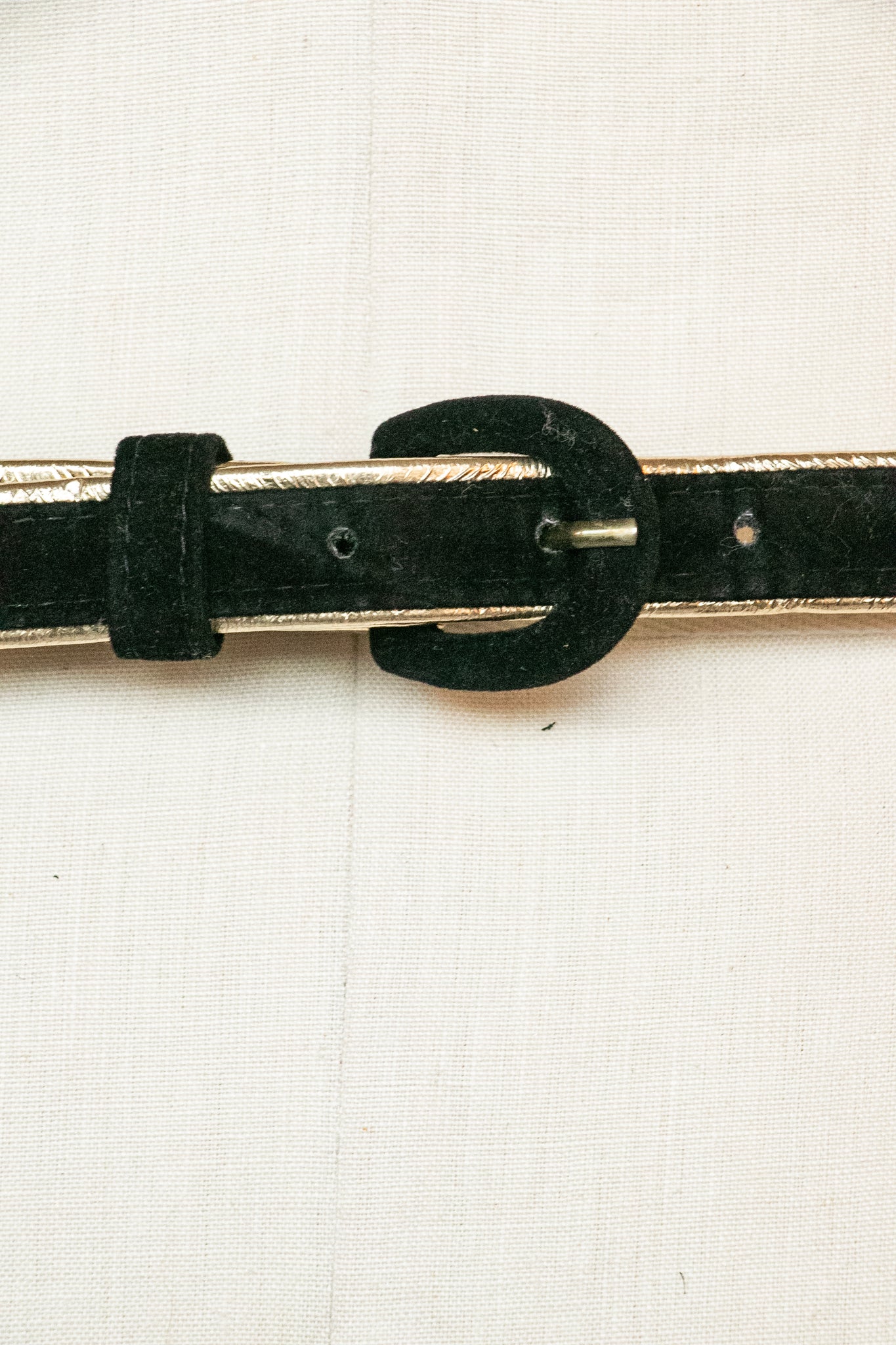 beltA vintage 1950s thing waist cinch belt of black crushed velvet with gold foil edges and backing. Simple rounded shape buckle, adjustable fit.