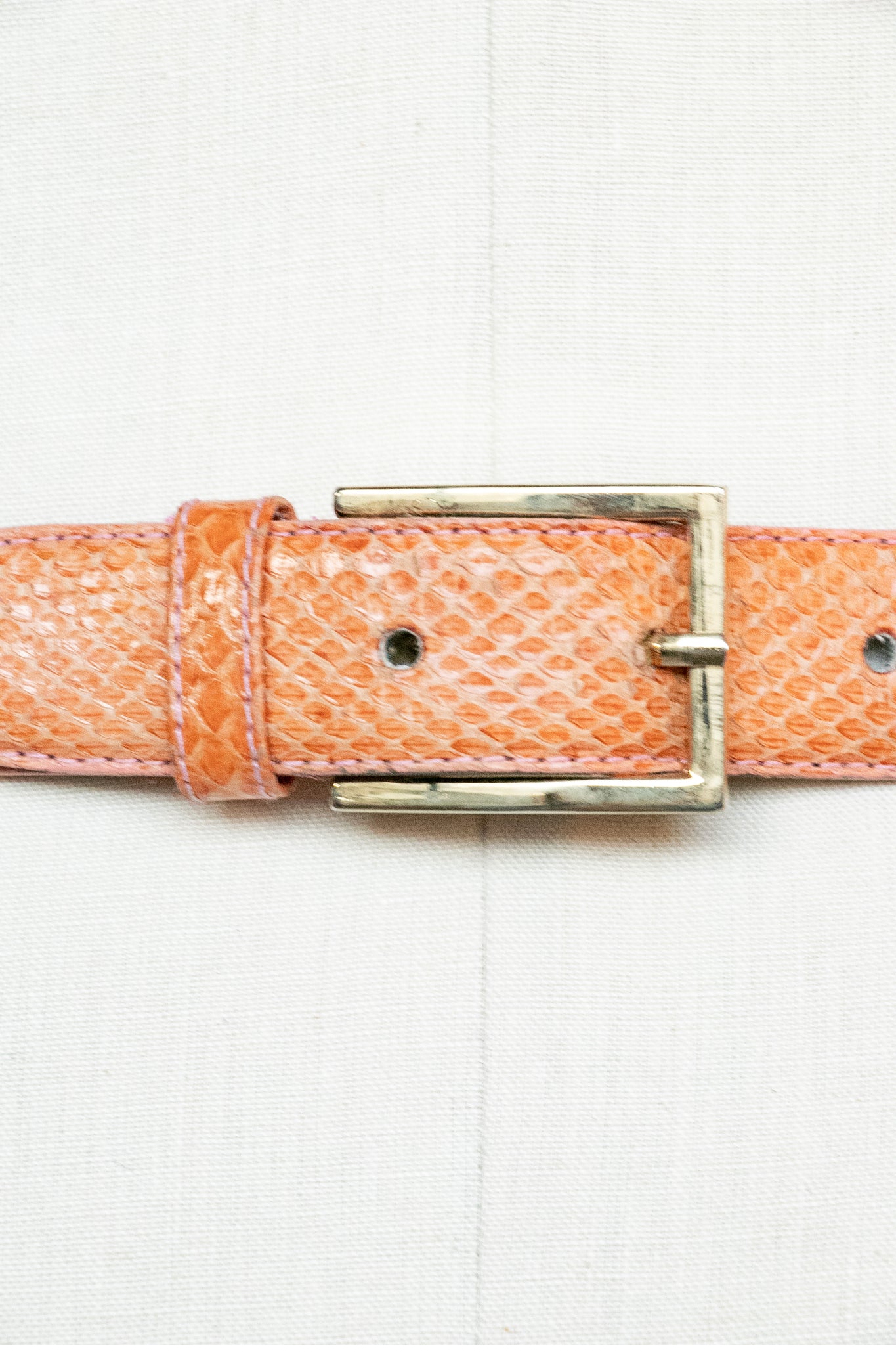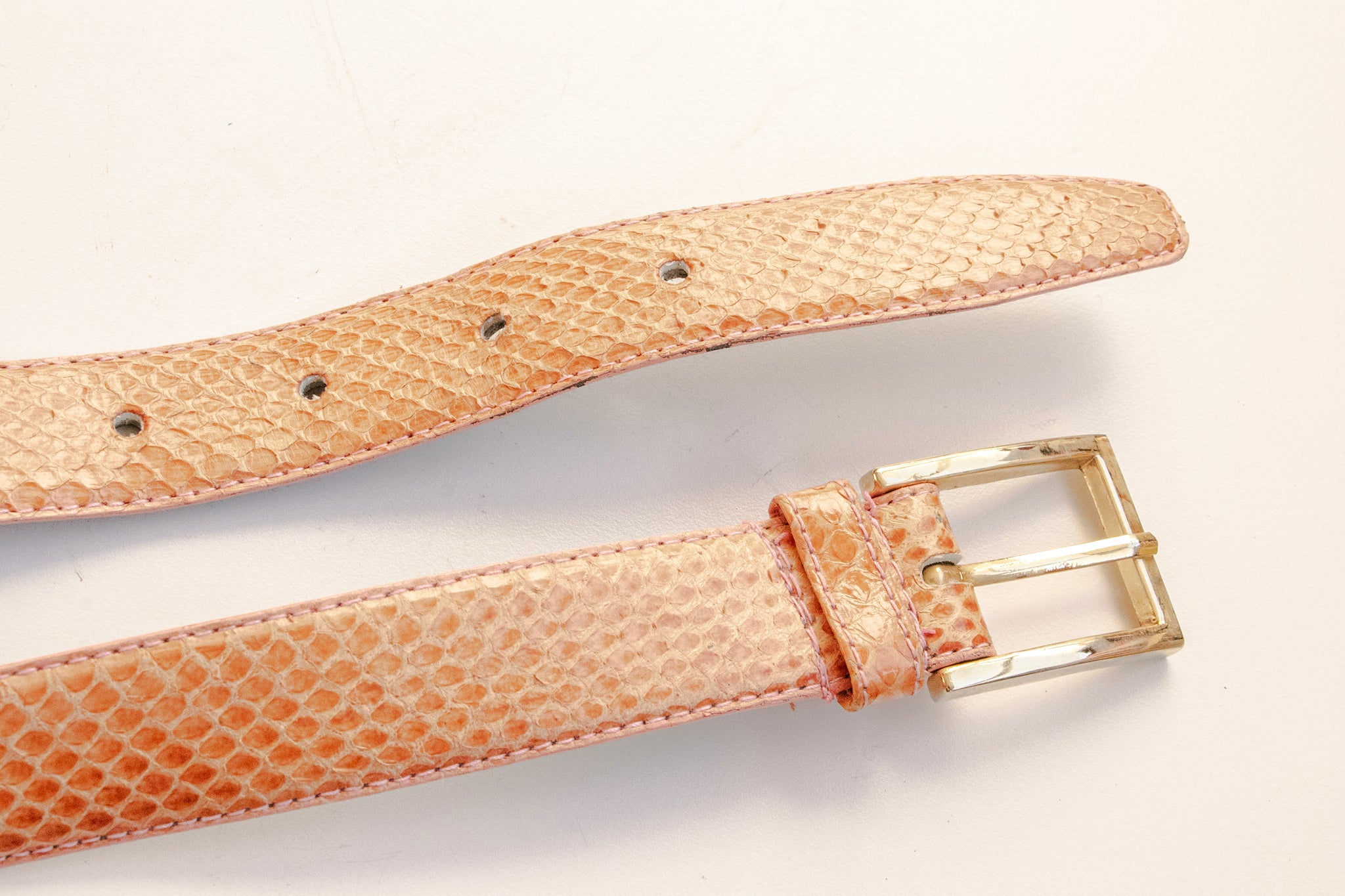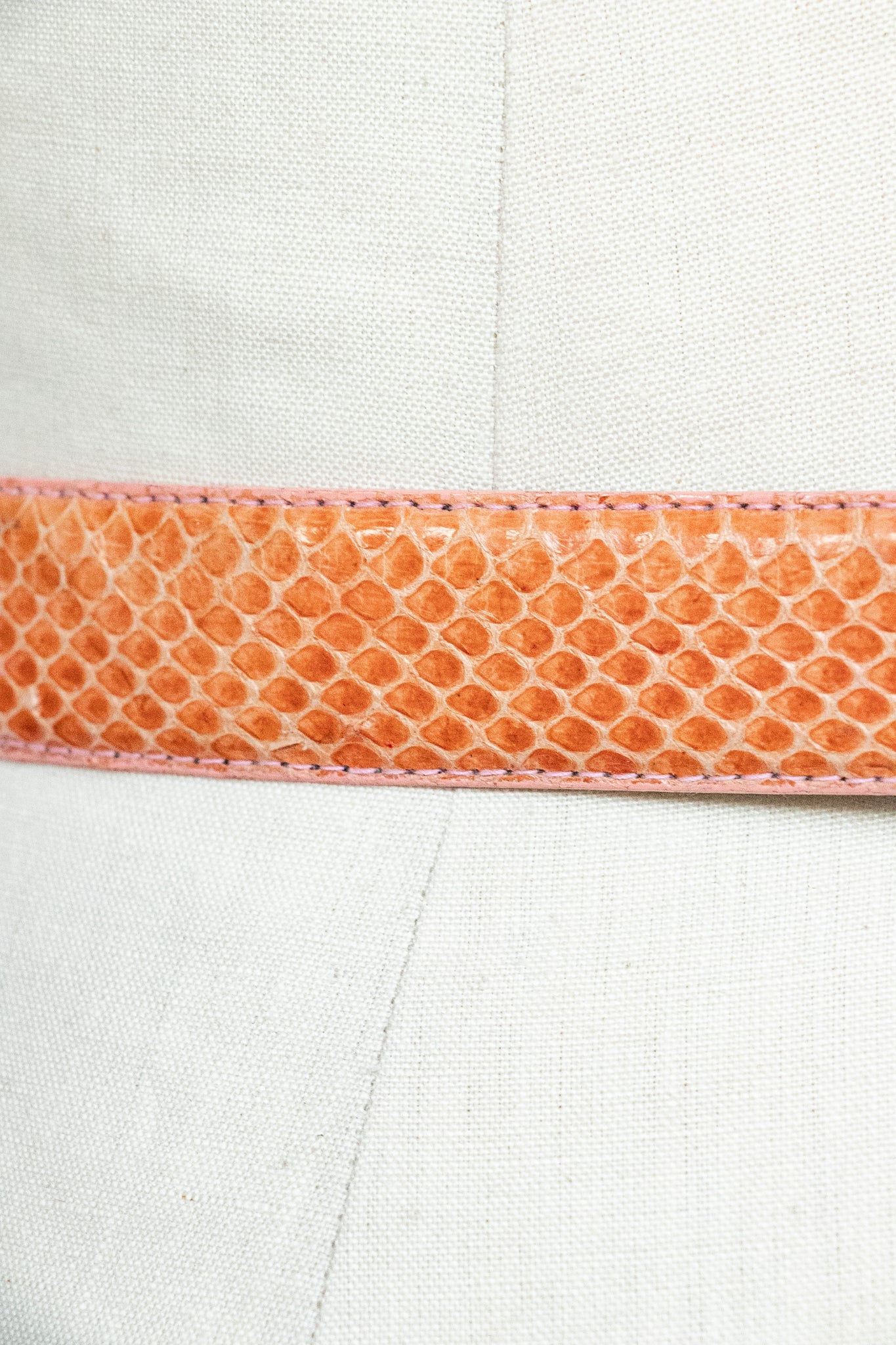 beltA vintage 1980s snakeskin belt in a lovely shade, almost terra cotta with bright pink top stitched edges. Simple square buckle in gold ton metal with adjustable holes on band.