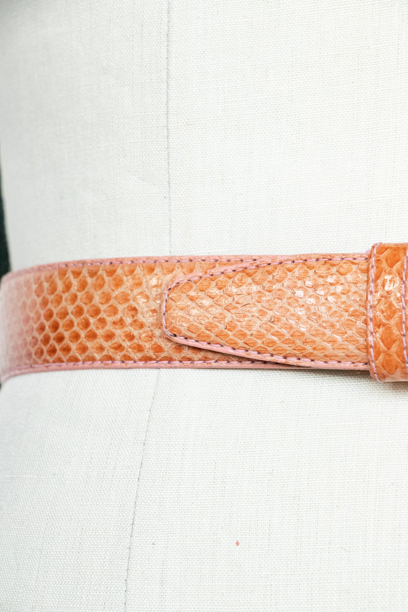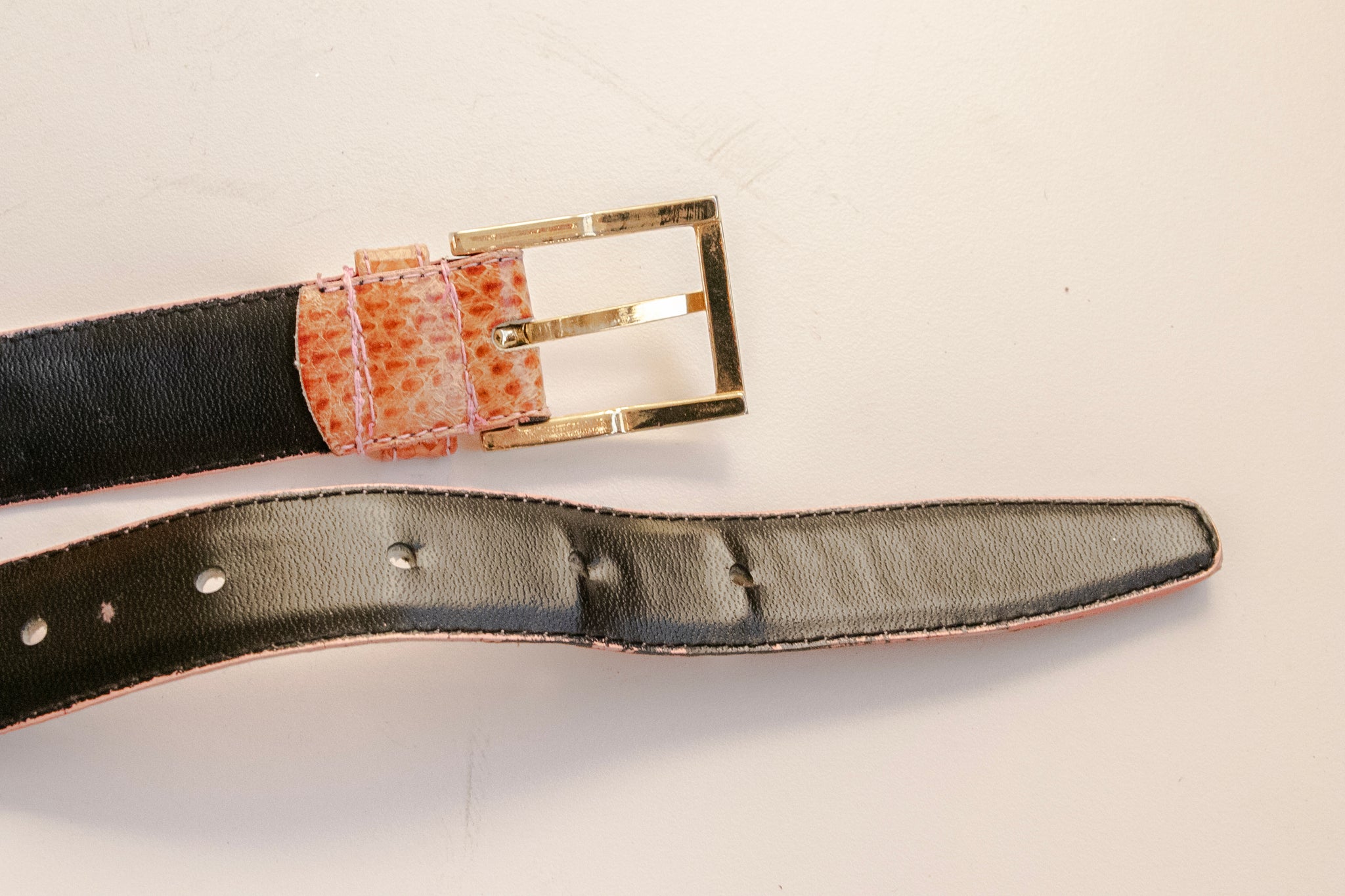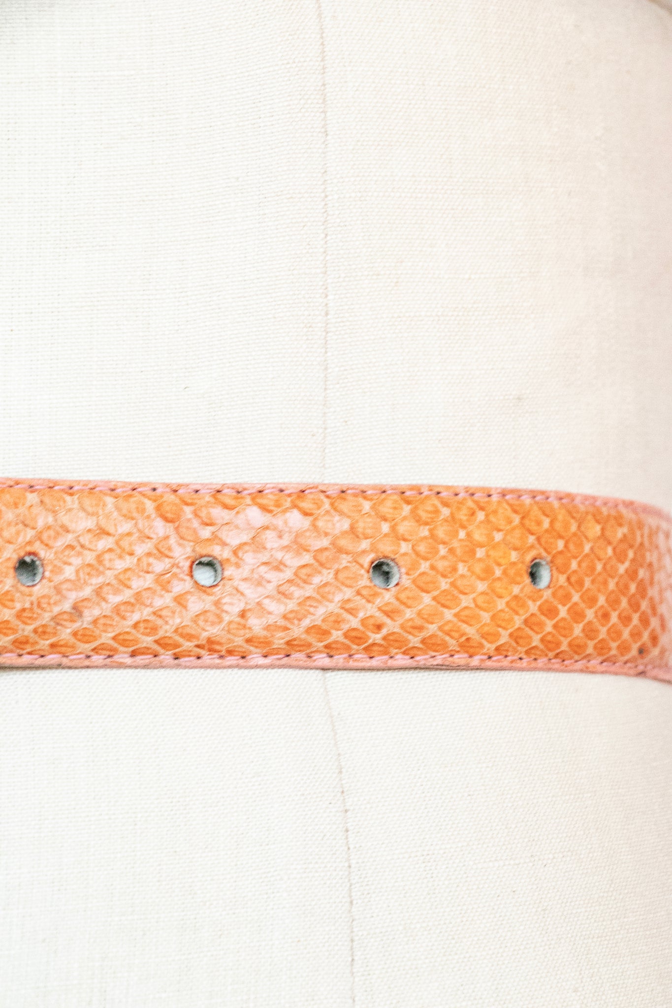 beltA vintage 1980s snakeskin belt in a lovely shade, almost terra cotta with bright pink top stitched edges. Simple square buckle in gold ton metal with adjustable holes on band.