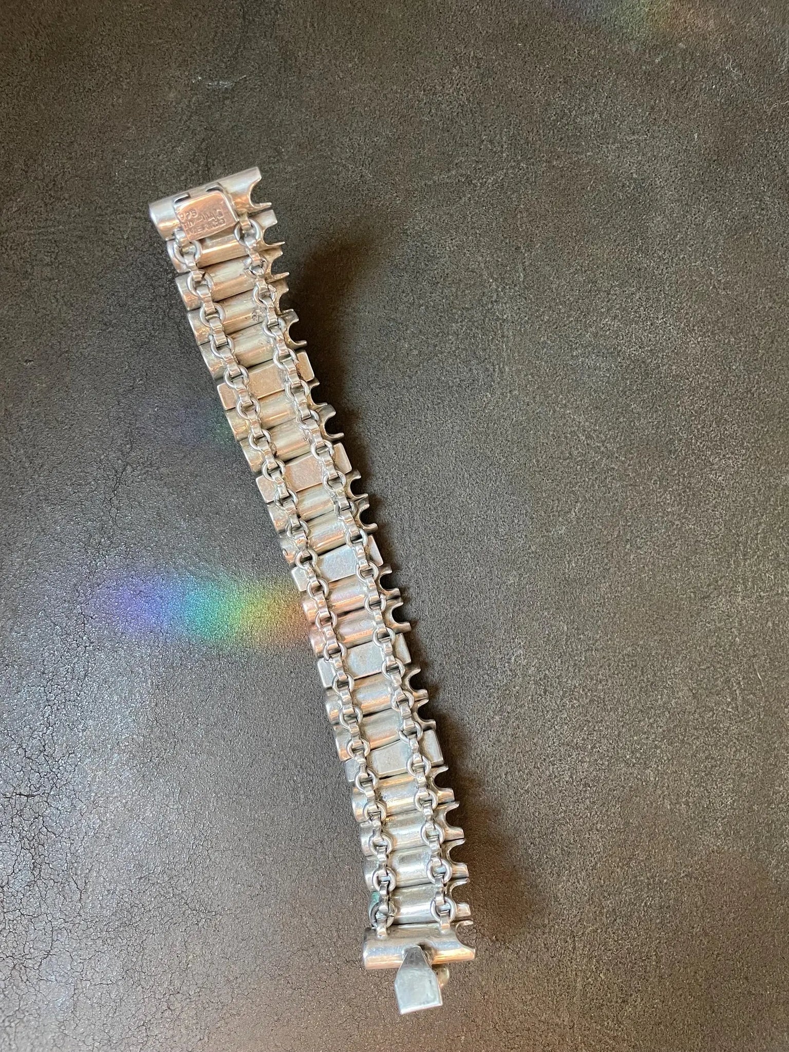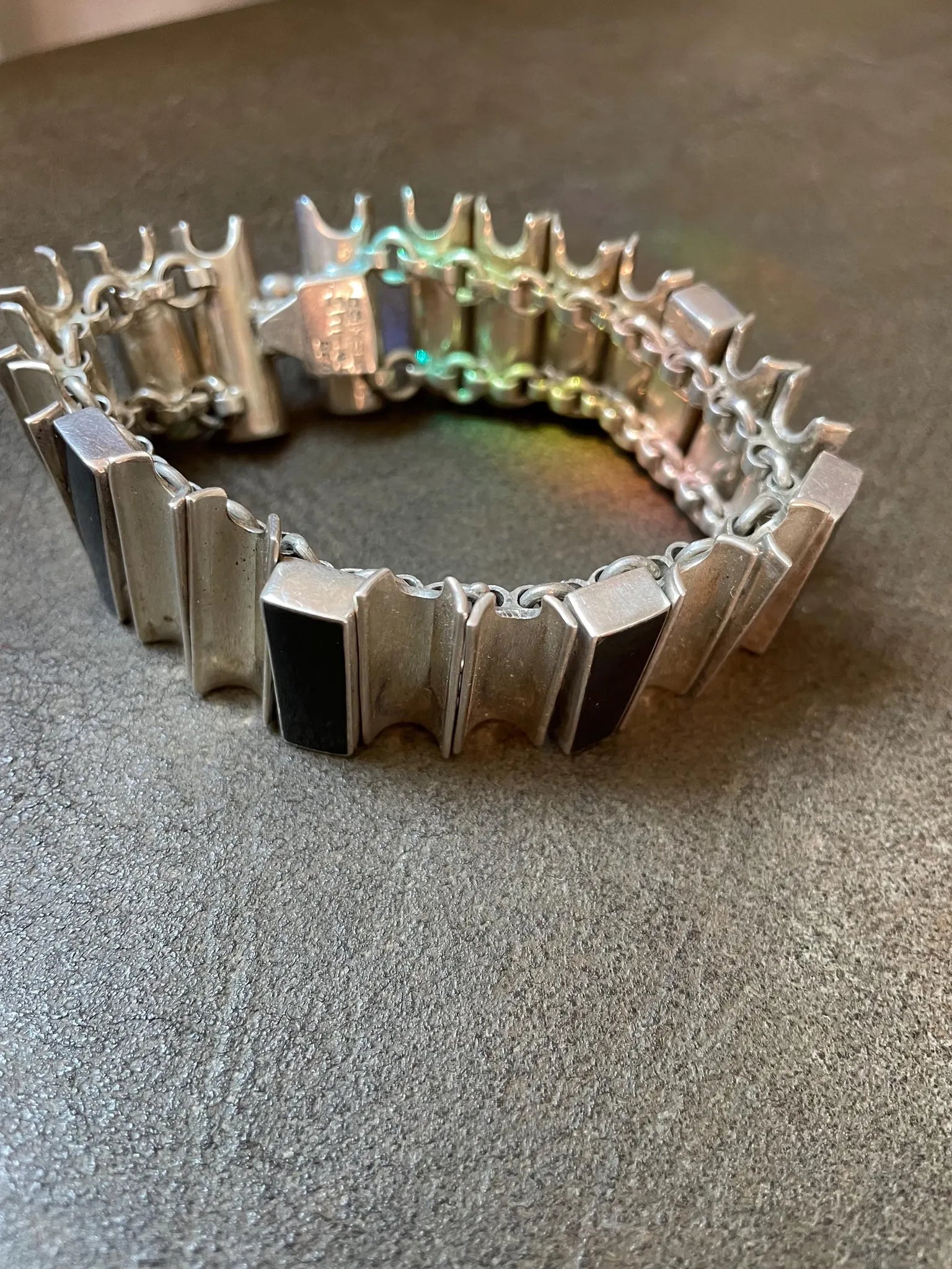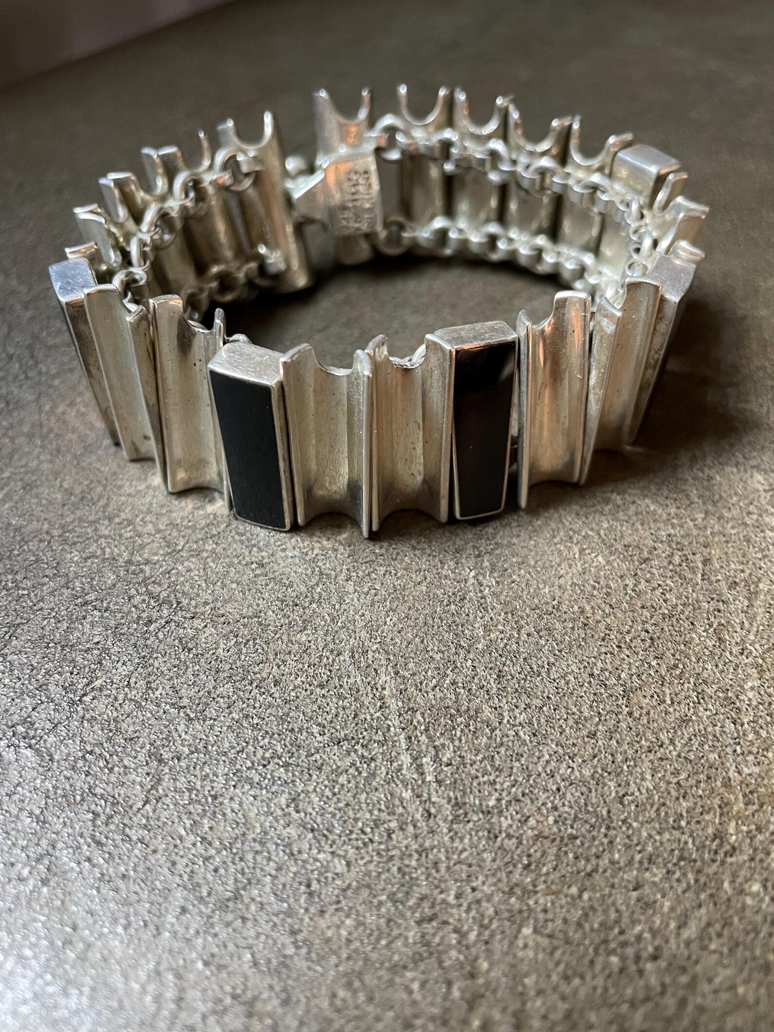 Beautiful vintage sterling and onyx stones modernist Taxco Bracelet. Constructed in asymmetric chunky links backed with loops. Has some flexibility but stays curved. Heavy weight but surprisingly comfortable. Has a push-in clasp  in good working condition.